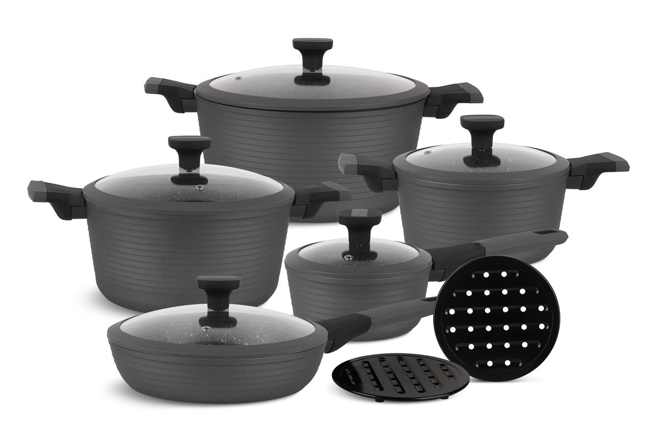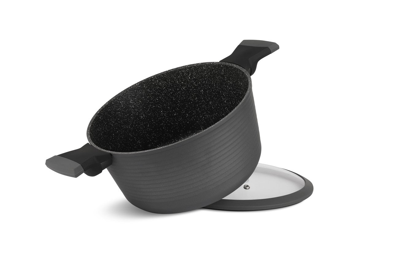 Deze prachtige pannenset van Edënbërg wordt geproduceerd onder de strengste Duitse normen en met het beste aluminium. De bodem is bedekt met maar liefst 3 lagen marmer met een mooie zwarte binnenkant die niet verkleurd. Dankzij de dikke bodem zijn de pannen zeer duurzaam en wordt het eten gelijkmatig verwarmd. De 3 lagen marmer bodem is de beste anti-aanbaklaag die je je kunt wensen. Het materiaal is tot wel 7 x sterker dan een traditionele anti-aanbaklaag en eten kan niet aankoeken. Je kunt daardoor zonder of met een klein beetje olie of boter gezonde maar ook lekkere gerechten op tafel zetten. Darnaast zijn de pannen door de marmeren lagen veel makkelijker met de hand of in de vaatwasser schoon te maken. De marmeren lagen behouden hun klaar, zijn minder kwetsbaar, distribueren warmte perfect en bevatten absoluut GÉÉN gifitige stoffen. Wat wilt de professionele of hobby kok nog meer? De uitgebreide set is ideaal voor de starter maar ook voor de ervaren kok ter vervanging of aanvulling van de huidige pannen. Of je nu voor iedereen een visje wilt grillen op de plaat, een stukje vlees wilt bakken in de pannen, een verse saus bereiden of de groenten koken: het kan allemaal op een gemakkelijk wijze zonder aankoeken en moeilijk schoonmaken. Belangrijkste kenmerken :
