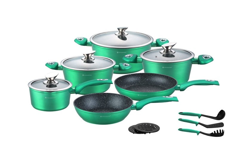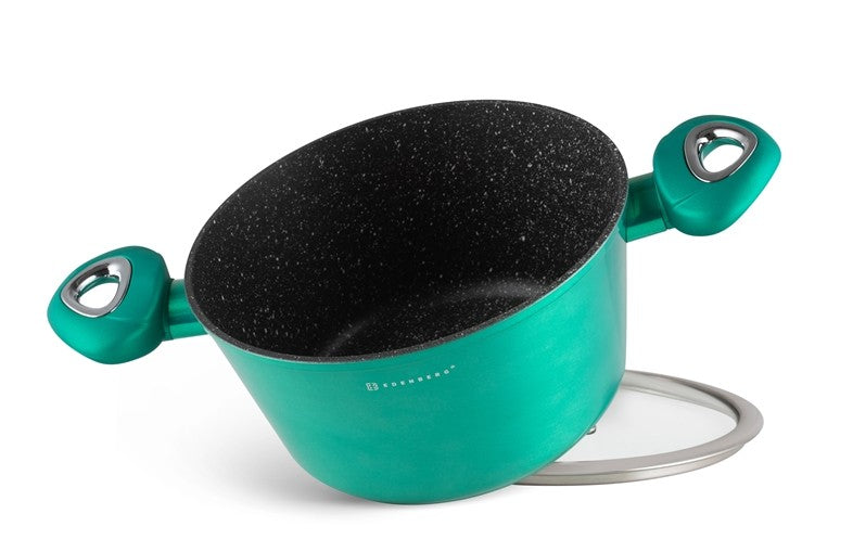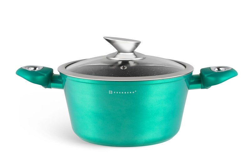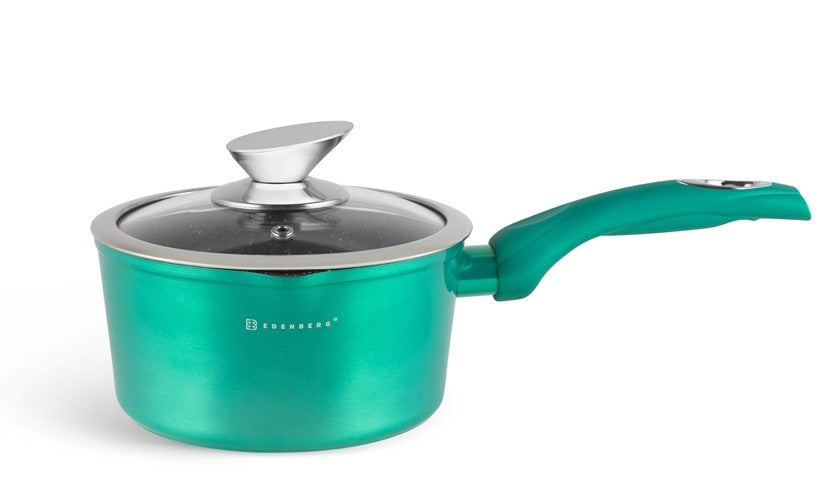 Deze prachtige pannenset van Edënbërg wordt geproduceerd onder de strengste Duitse normen en met het beste aluminium. De bodem is bedekt met maar liefst 3 lagen marmer met een mooie zwarte binnenkant die niet verkleurd. Dankzij de dikke bodem zijn de pannen zeer duurzaam en wordt het eten gelijkmatig verwarmd. De pannen kunnen worden gebruik op een kookplaat en ook op een fornuis met inductie. De 3 lagen marmer bodem is de beste anti-aanbaklaag die je je kunt wensen. Het materiaal is tot wel 7 x sterker dan een traditionele anti-aanbaklaag en eten kan niet aankoeken. Je kunt daardoor zonder of met een klein beetje olie of boter gezonde maar ook lekkere gerechten op tafel zetten. Darnaast zijn de pannen door de marmeren lagen veel makkelijker met de hand of in de vaatwasser schoon te maken. De marmeren lagen behouden hun klaar, zijn minder kwetsbaar, distribueren warmte perfect en bevatten absoluut GÉÉN gifitige stoffen. Wat wilt de professionele of hobby kok nog meer? De uitgebreide set is ideaal voor de starter maar ook voor de ervaren kok ter vervanging of aanvulling van de huidige pannen. Of je nu voor iedereen een visje wilt grillen op de plaat, een stukje vlees wilt bakken in de pannen, een verse saus bereiden of de groenten koken: het kan allemaal op een gemakkelijk wijze zonder aankoeken en moeilijk schoonmaken. Belangrijkste kenmerken :