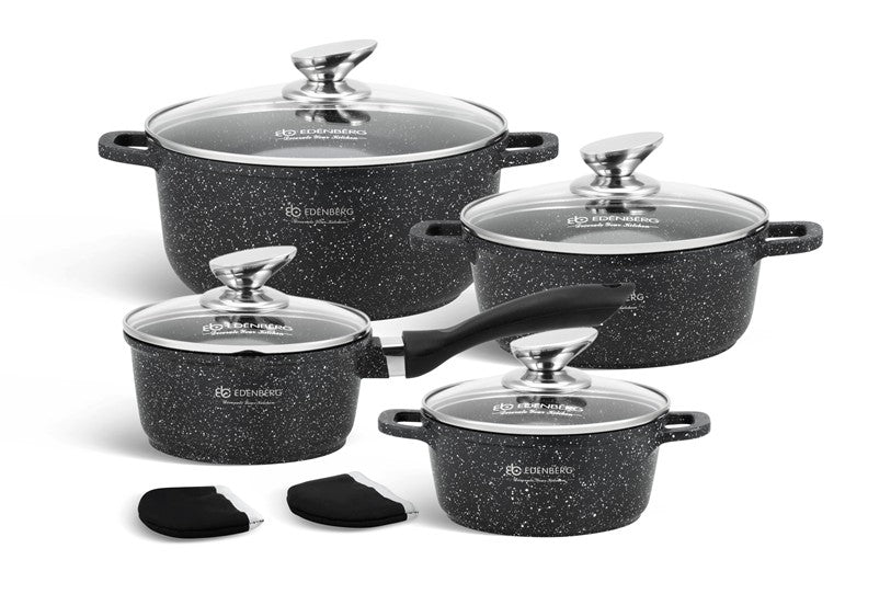 Prachtige 10-delige pannenset van hoge kwaliteit. Een set gemaakt van hoogwaardig gesmeed aluminium en een marmeren coating. Door de marmeren coating bakken je gerechten absoluut niet aan. Tevens is deze pannenset voorzien van een antikleeflaag waardoor het mogelijk is om vetarm te koken. U kunt de pannenset veilig gebruiken in een afwasmachine. De pannen zijn geschikt voor alle warmtebronnen: elektrisch, gas, keramisch, halogeen en inductie. Daarnaast is het ook mogelijk om dit product in de oven te gebruiken ( zonder deksel ) Belangrijkste kenmerken :