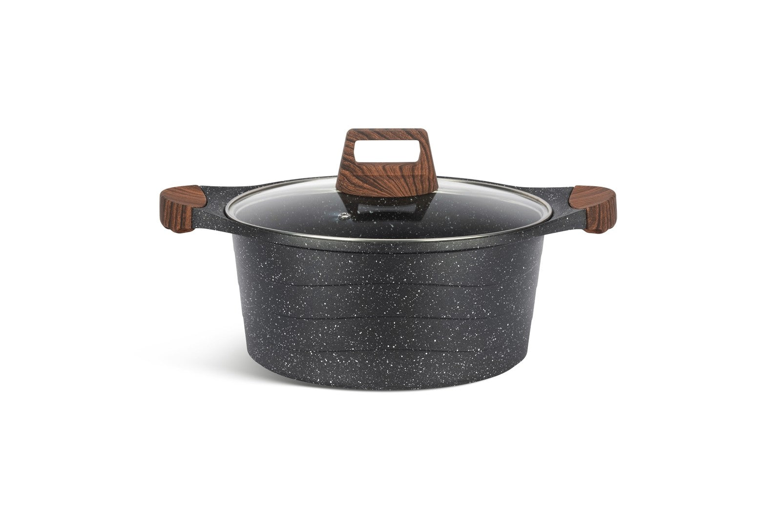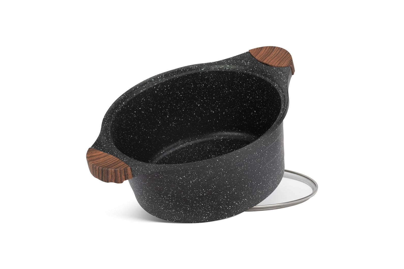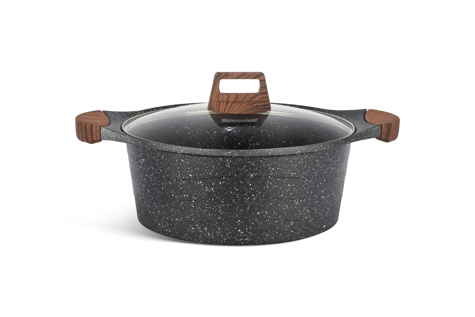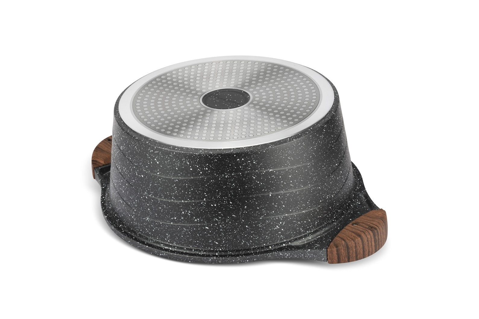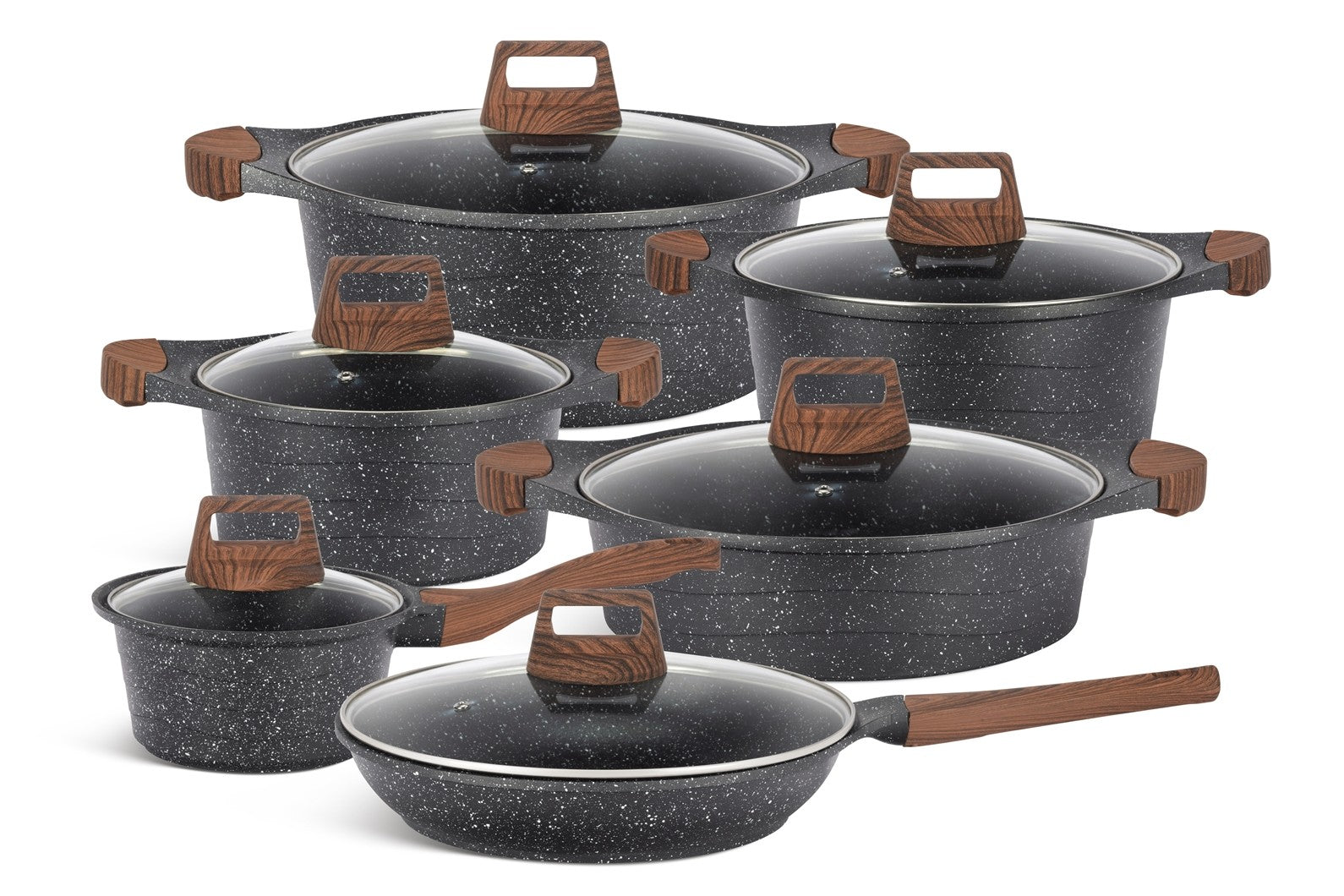 Prachtige 12-delige pannenset van hoge kwaliteit. Een set gemaakt van hoogwaardig gesmeed aluminium en een marmeren coating. Door de marmeren coating bakken je gerechten absoluut niet aan. Tevens is deze pannenset voorzien van een antikleeflaag waardoor het mogelijk is om vetarm te koken. U kunt de pannenset veilig gebruiken in een afwasmachine. De pannen zijn geschikt voor alle warmtebronnen: elektrisch, gas, keramisch, halogeen en inductie. Daarnaast is het ook mogelijk om dit product in de oven te gebruiken ( zonder deksel )