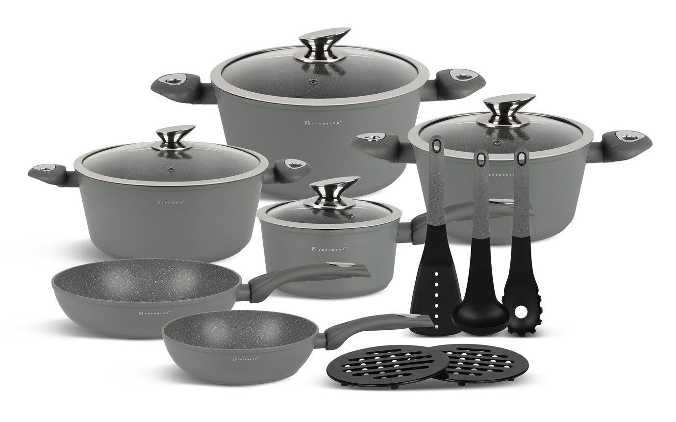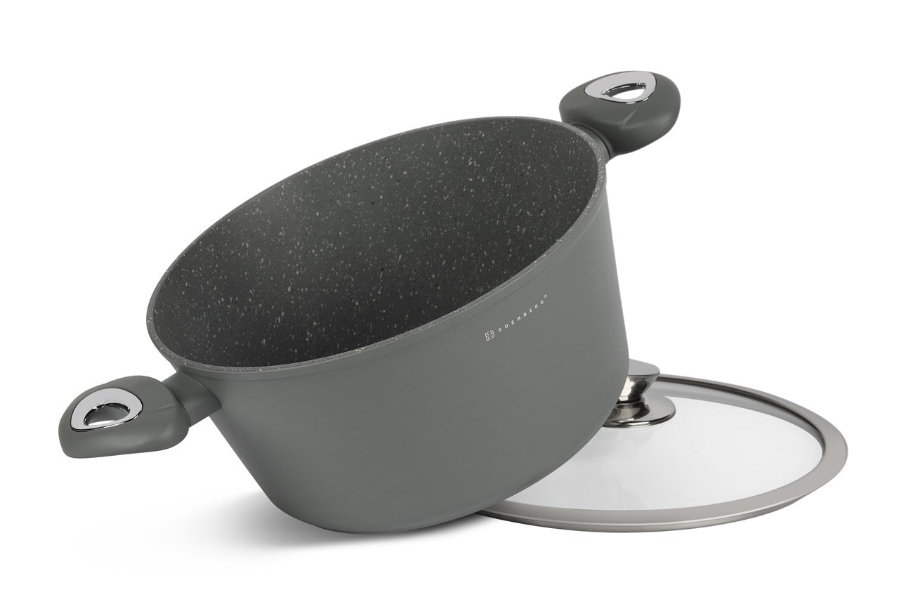 Deze prachtige pannenset van Edënbërg wordt geproduceerd onder de strengste Duitse normen en met het beste aluminium. De bodem is bedekt met maar liefst 3 lagen marmer met een mooie zwarte binnenkant die niet verkleurd. Dankzij de dikke bodem zijn de pannen zeer duurzaam en wordt het eten gelijkmatig verwarmd. De pannen kunnen worden gebruik op een kookplaat en ook op een fornuis met inductie.