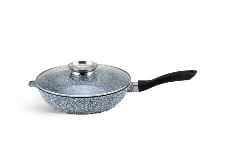 - Gegoten aluminium, met keramische/marmeren coating, ideaal voor aanbraden, en vetarm koken