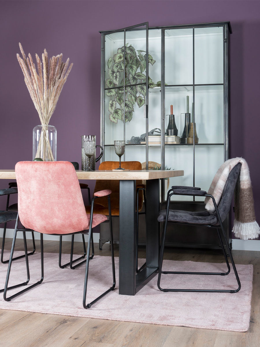 - Door het gebruik van verschillende materialen, zoals fluweel en metaal, past de stoel in meerdere woonstijlen