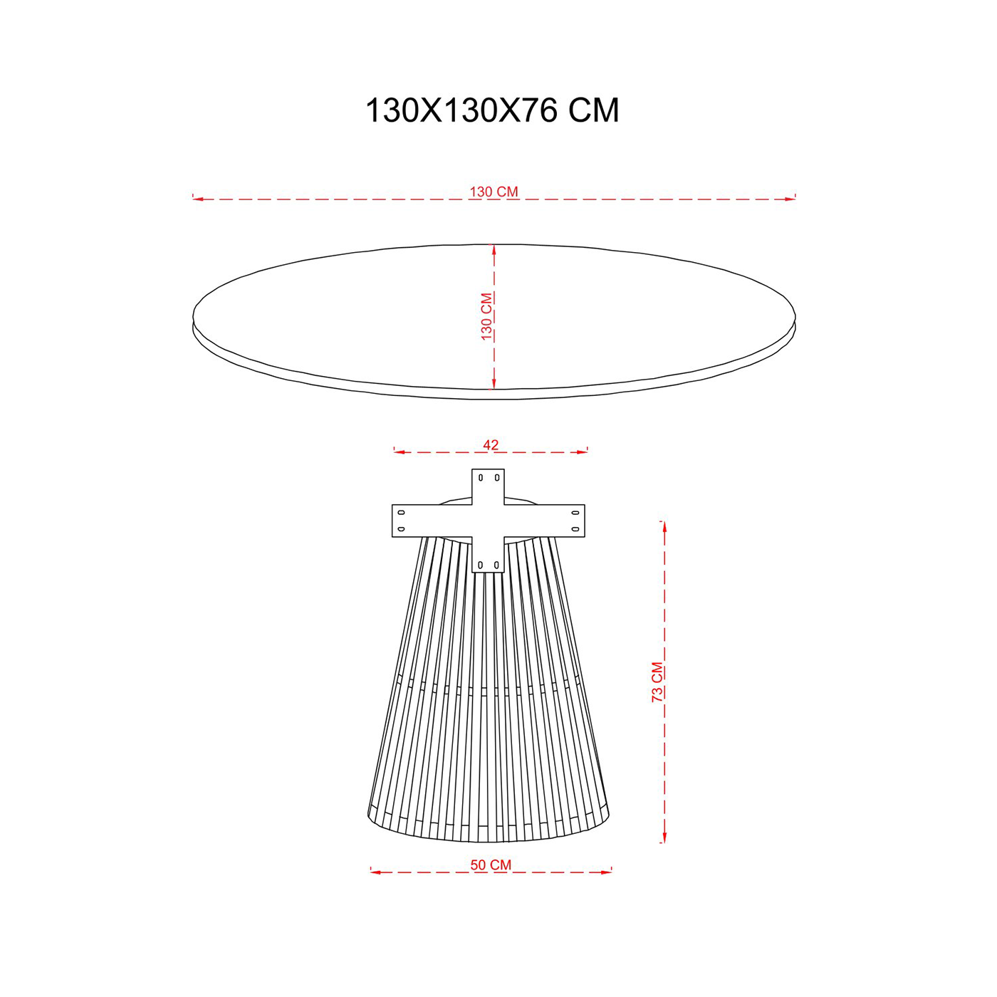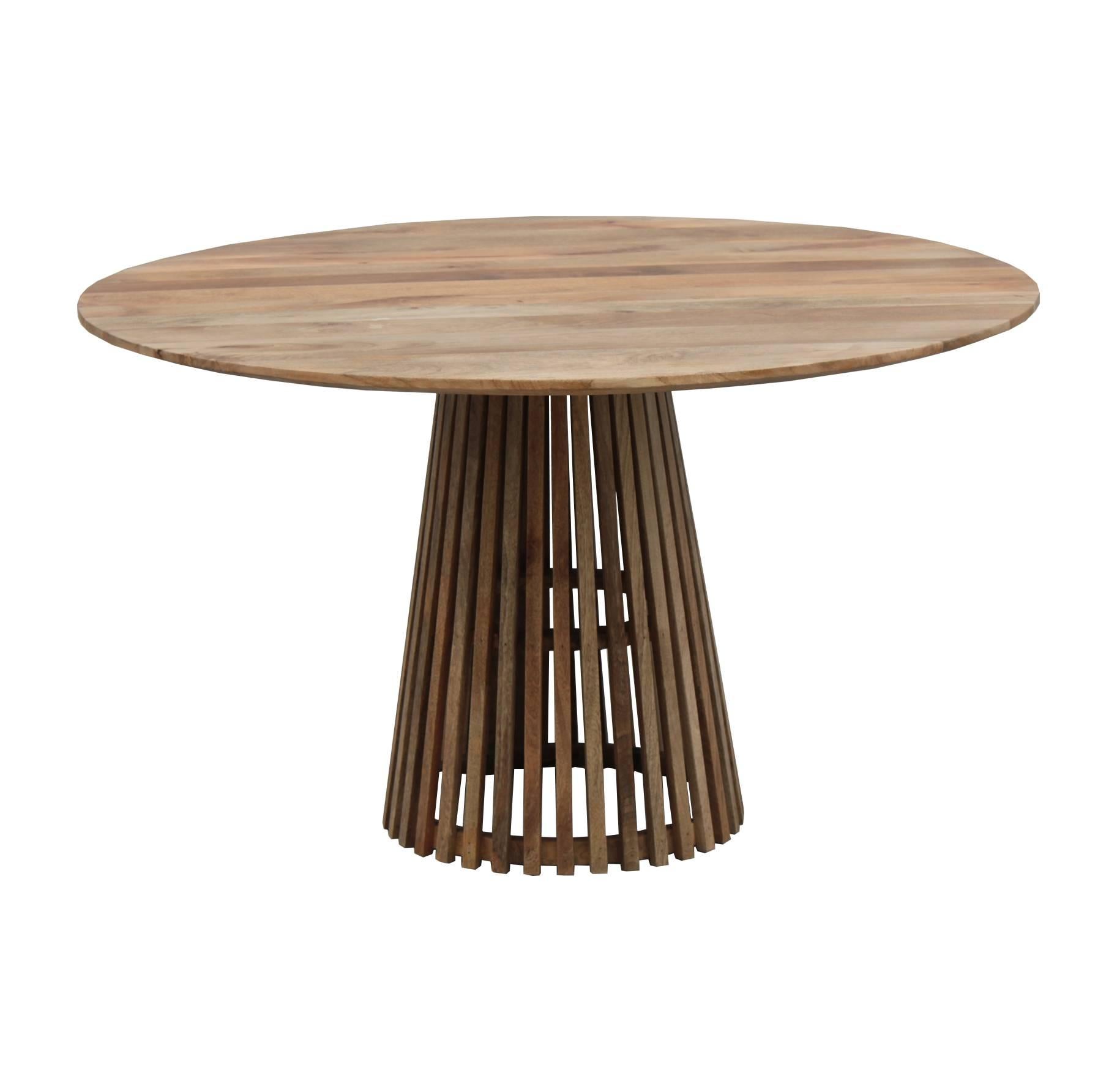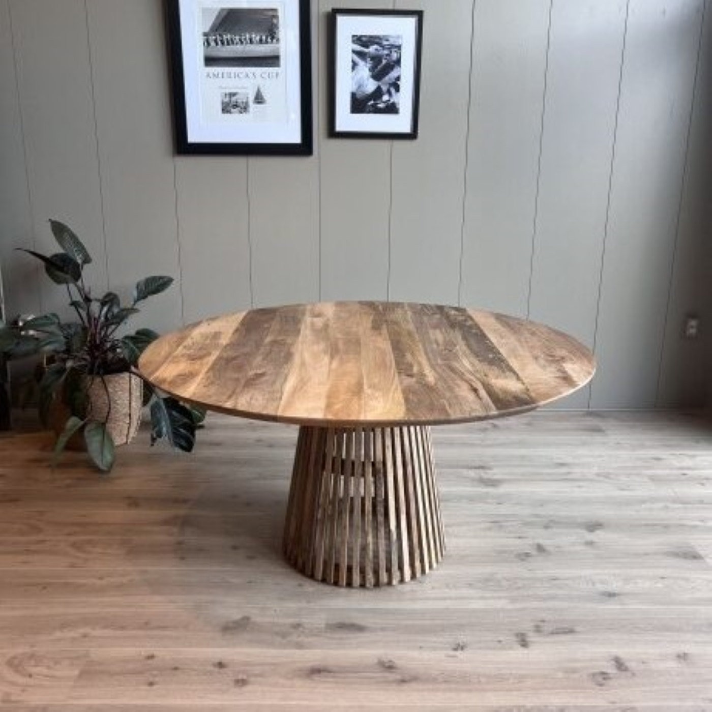 Eetkamertafel Porto is een prachtige ronde eettafel van massief mangohout in een natuurlijke hout kleur. De ronde eettafel heeft een diameter van 130cm. Naast het ronde blad heeft de eettafel ook een ronde poot gemaakt van spijlen mango hout. de poot loopt van smal naar breed waardoor er genoeg been ruimte ontstaat. Hierdoor kan je nog meer eetkamerstoelen plaatsen aan deze bijzondere en mooie eettafel. Doordat de tafel glad is afgewerkt en daarna in de lak is gezet geeft dit uw interieur een speels maar ook een warme uitstraling! De lijnen die over de poot lopen geven een speelse twist.