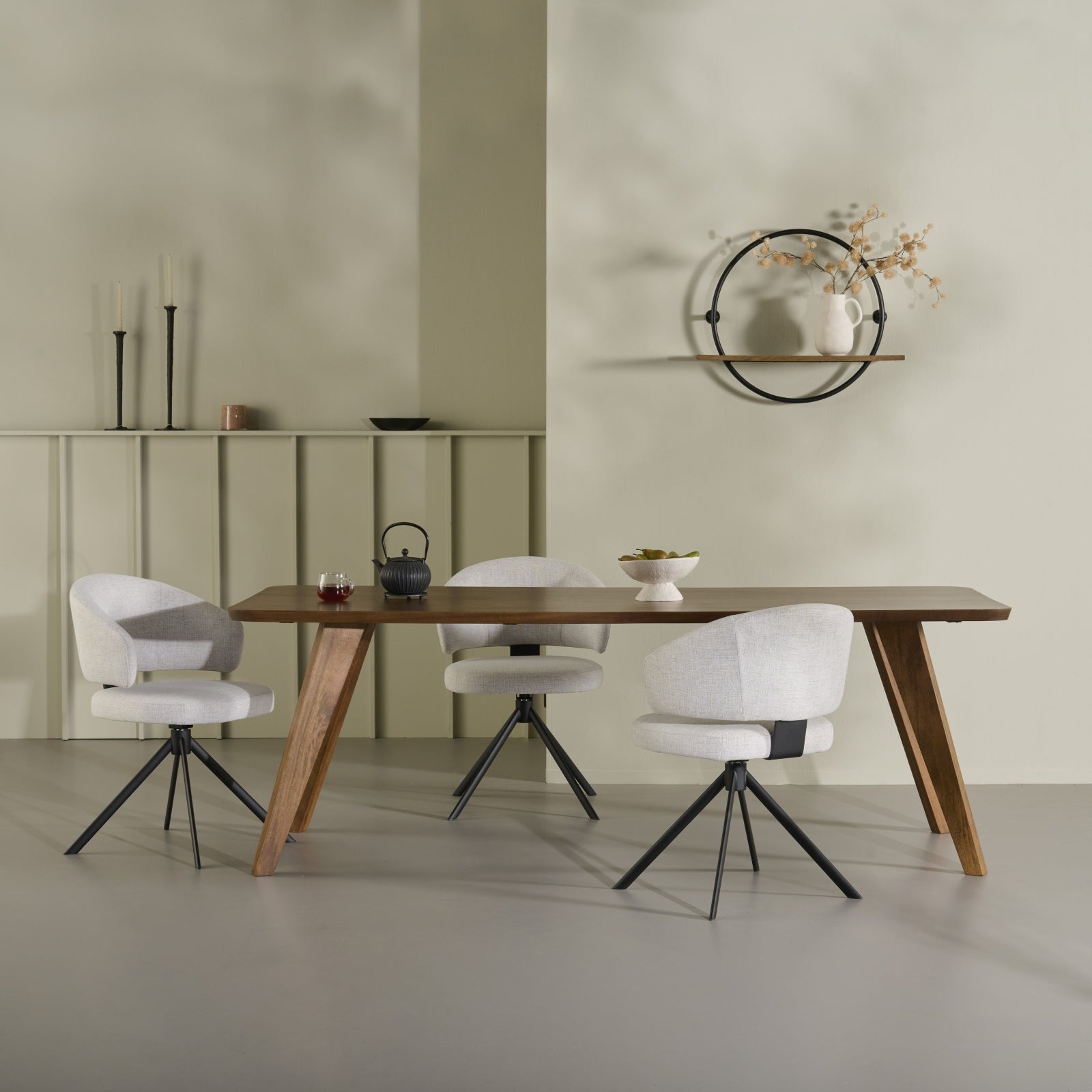 Met eettafel Vaasa voeg je op stijlvolle wijze een centraal punt toe aan je interieur voor onvergetelijke momenten. Perfect voor sfeervolle diners met familie en vrienden. Deze eettafel is vervaardigd van mangohout, een materiaal met een warme en unieke vlamtekening die elk exemplaar bijzonder maakt. De strakke facetafwerking straalt eenvoud en klasse uit, terwijl de schuin geplaatste poten zorgen voor een speelse touch. Eettafel Vaasa is daarmee een echte eyecatcher met een eigen karakter.- afmeting 220x76x90 cm (bxhxd)