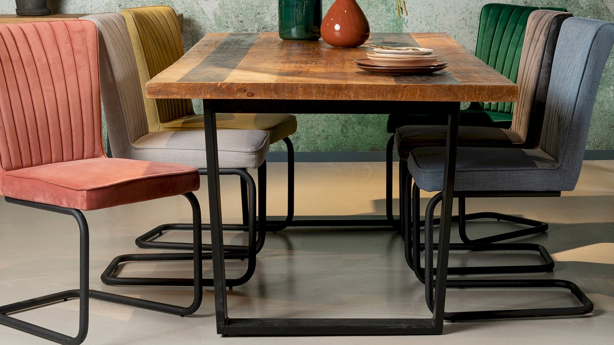 Eetkamerstoel Pallas is verkrijgbaar in vier kleuren velvet stof en vier kleuren jeans stof.