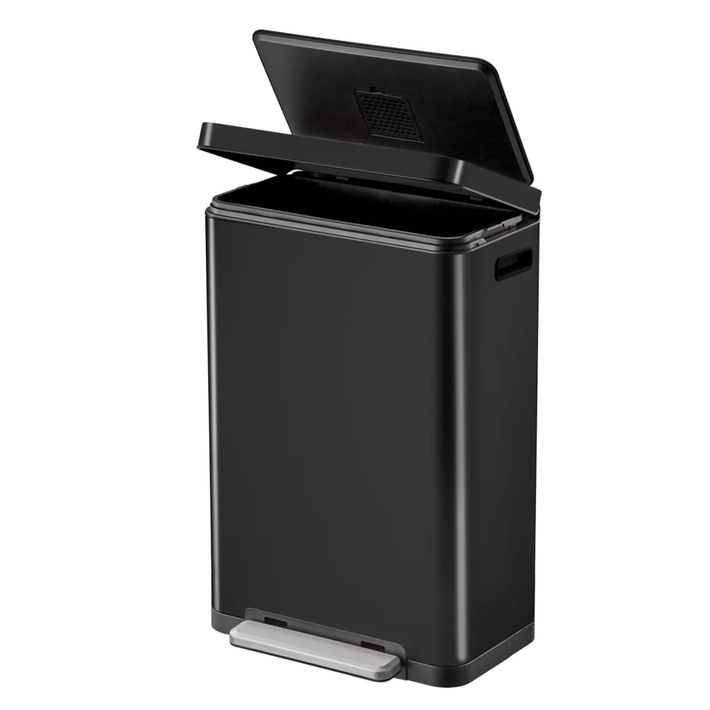 De zwarte X-Cube pedaalemmer met extra breed pedaal van EKO is een trendy, rechthoekige afvalbak met een kunststof binnenbak van 30 L. Dit is een ideale vuilnisbak voor elke moderne keuken. Bovendien is hij uitgerust met een geruisloos sluitend deksel en een openhoud-functie. De pedaalemmer is gemaakt van geborsteld roestvrij staal en heeft een ingenieuze, vingerafdrukbestendige coating en een nanozilver anti-bacteriële coating. Verder zorgt de siliconen afdichtingsring ervoor dat nare geurtjes effectief worden vastgehouden in de afvalbak. Ook zit er een ingebouwd geurfilter in het deksel. Verder houdt de vouwrand de bak open voor het eenvoudig verwisselen van de afvalzak en/of het verwijderen van de binnenbak.
