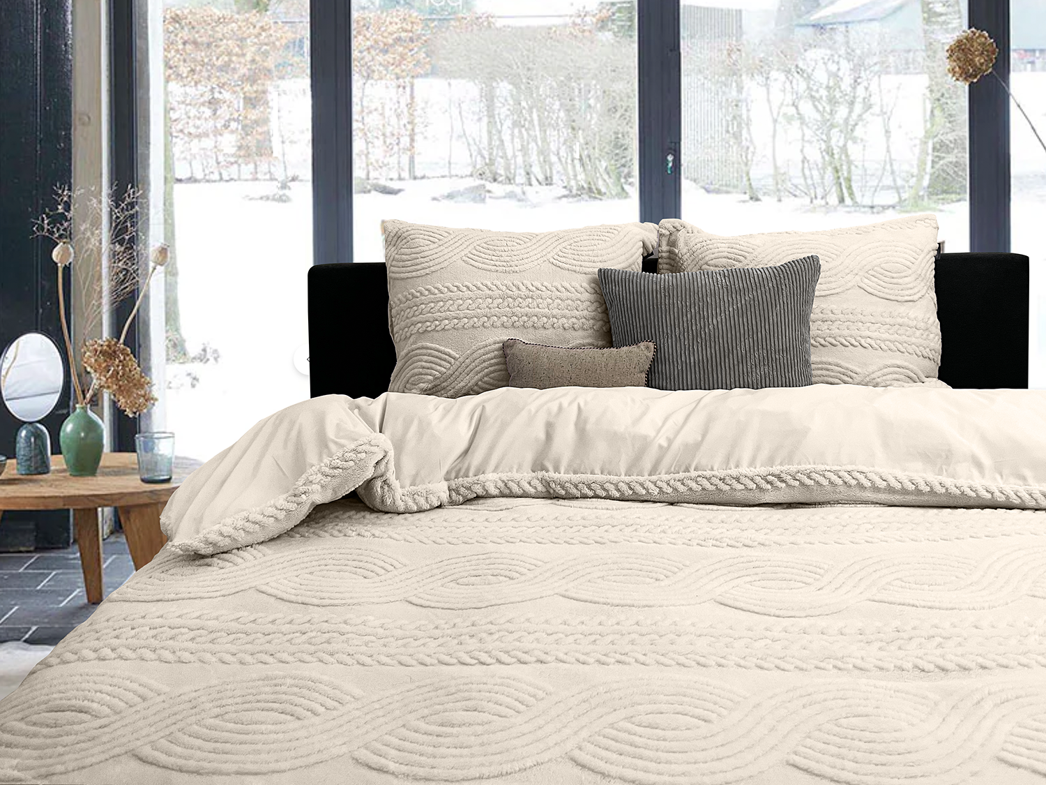 De bovenkant is gemaakt van hoogpolige teddy pluche: zacht, harig en met een hoog knuffelgehalte. Perfect voor de koukleumen onder ons. De onderzijde bestaat uit 100% microperkal, een lichtgewicht, ademende stof die soepel om je heen valt. Lekker slapen gegarandeerd.