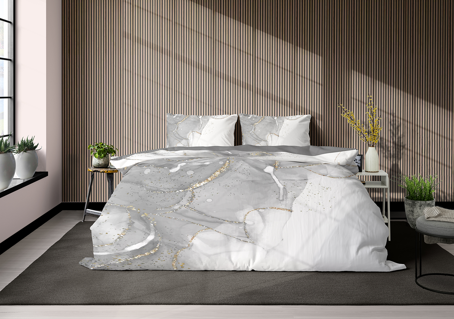 Dekbedovertrek Mystic Nights betovert met lichte gemarmerde grijstinten en subtiele gouden accenten die je slaapkamer laten stralen als een zachte sterrennacht.