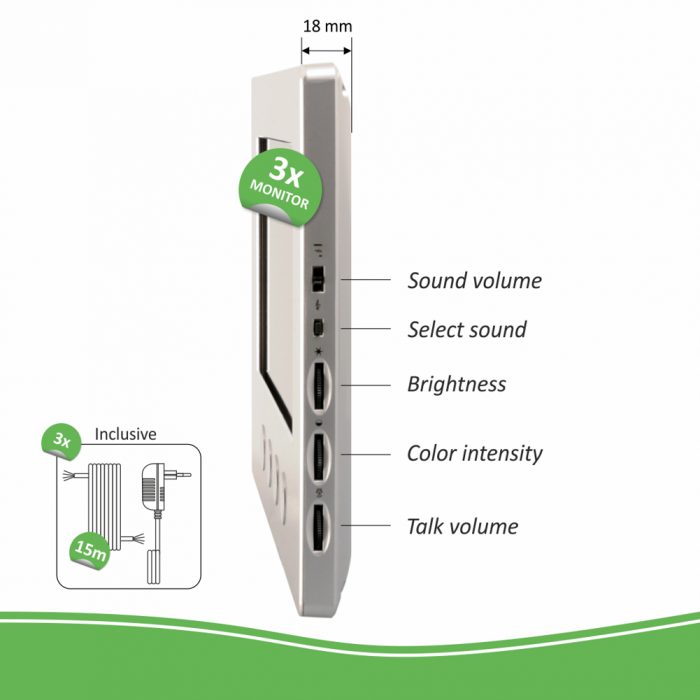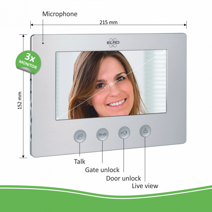 Dit systeem bestaat uit een robuuste deurbel en een 7 inch (18 centimeter) kleurenscherm. De behuizing van dit scherm is gefabriceerd uit hoogwaardig geborsteld aluminium wat voor een modern design zorgt. Met de vier knoppen die zijn bevestigd aan de voorkant van het scherm kun je kiezen uit verschillende opties, zoals live meekijken en communiceren met degene die voor je deur staat. Het is mogelijk om het spraak- en belvolume aan te passen en om de helderheid en kleurintensiteit te wijzigen van het scherm. Tevens kun je een keuze maken uit ruim 16 verschillende beltonen.