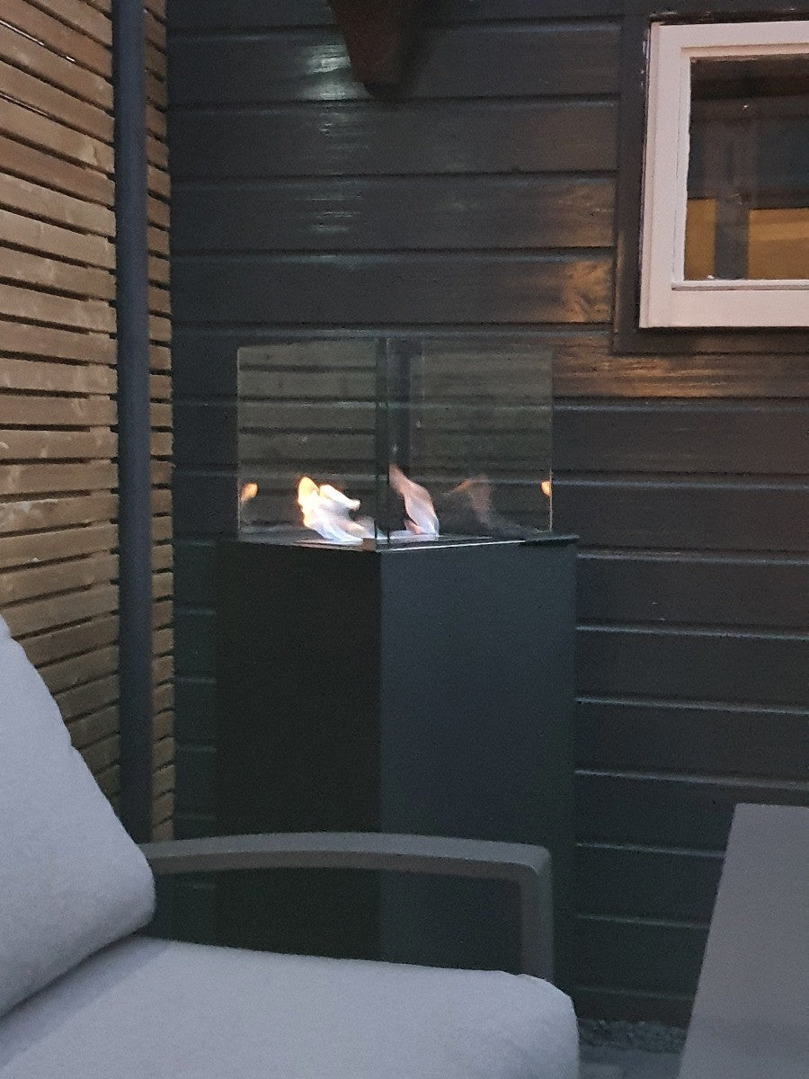 Deze stoere vuurzuil is geschikt voor binnen en buiten en heeft een ingebouwde ronde Bio-ethanol haard van 1-1,5 liter. De vuurzaal wordt geleverd met 4 glasplaten, die de haard buiten beschermen tegen de wind.