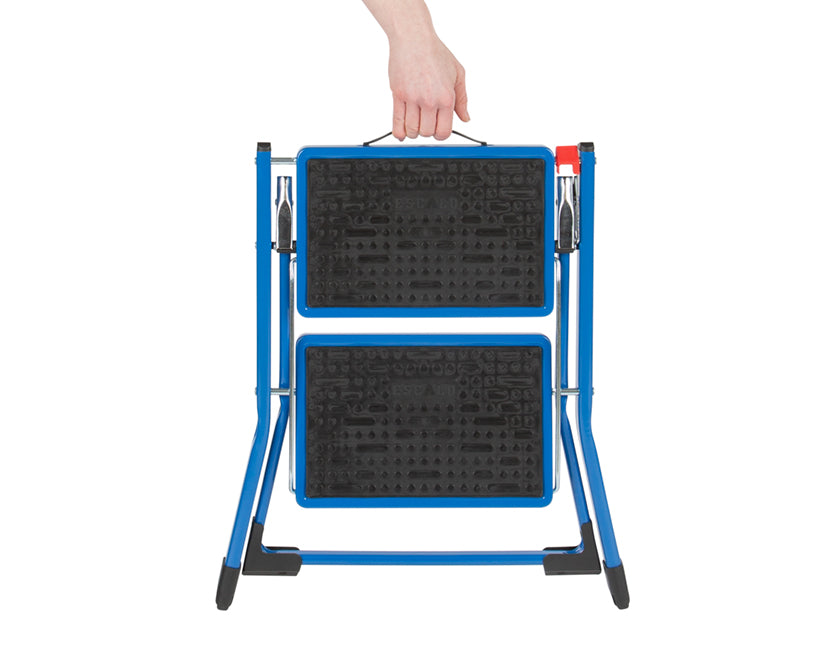 Gelakt staal Erg handig in gebruik, makkelijk en compact op te bergen Twee extra grote treden met antisliplaag: 30 x 20 cm Automatische vergrendeling van de treden Met handvat en antislipvoetjes