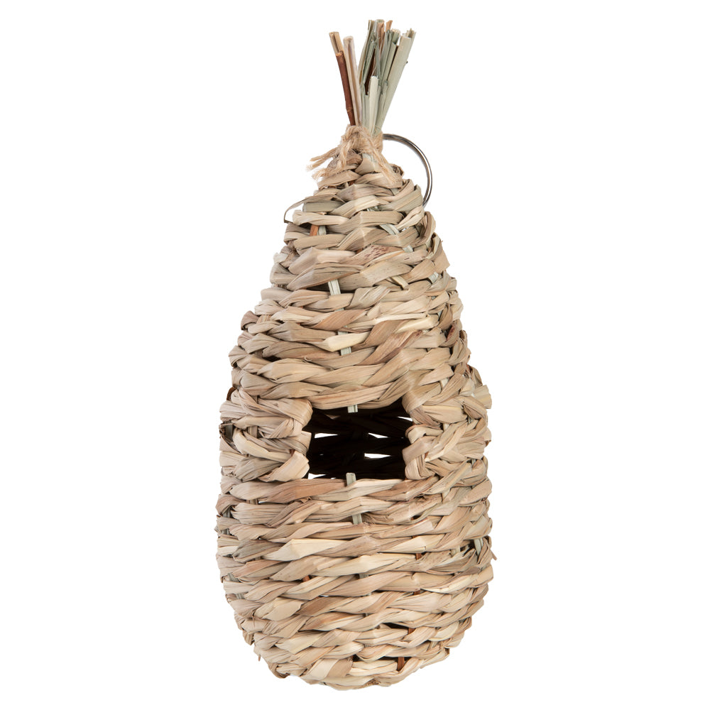 De Nestbuidel Winterkoning is een uniek vogelhuisje met een bijzonder uiterlijk. Zoals de naam doet vermoeden heeft hij het uiterlijk van een buidel in plaats van een huisje. De nestbuidel is gemaakt van zeegras. De Nestbuidel Winterkoning is circa 10 x 10 x 24 centimeter groot (lxbxh).