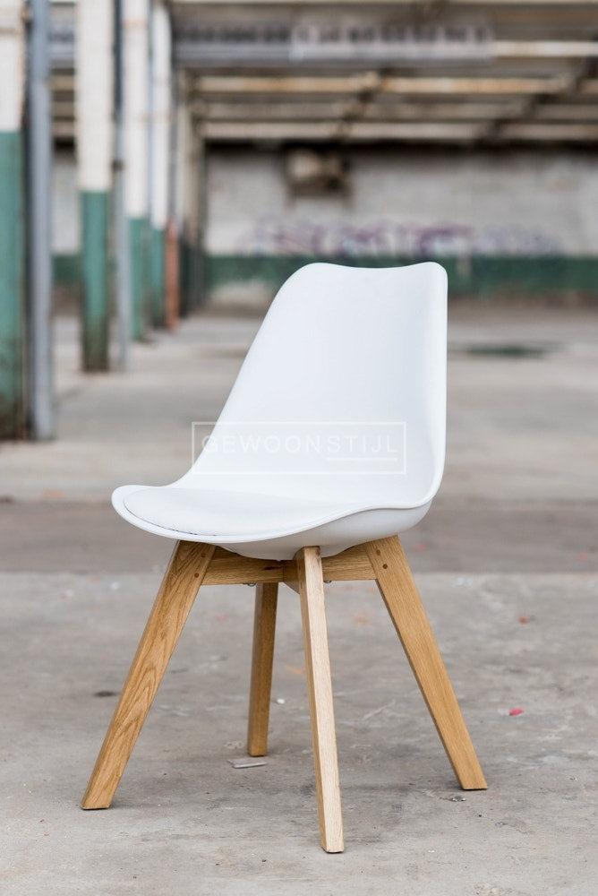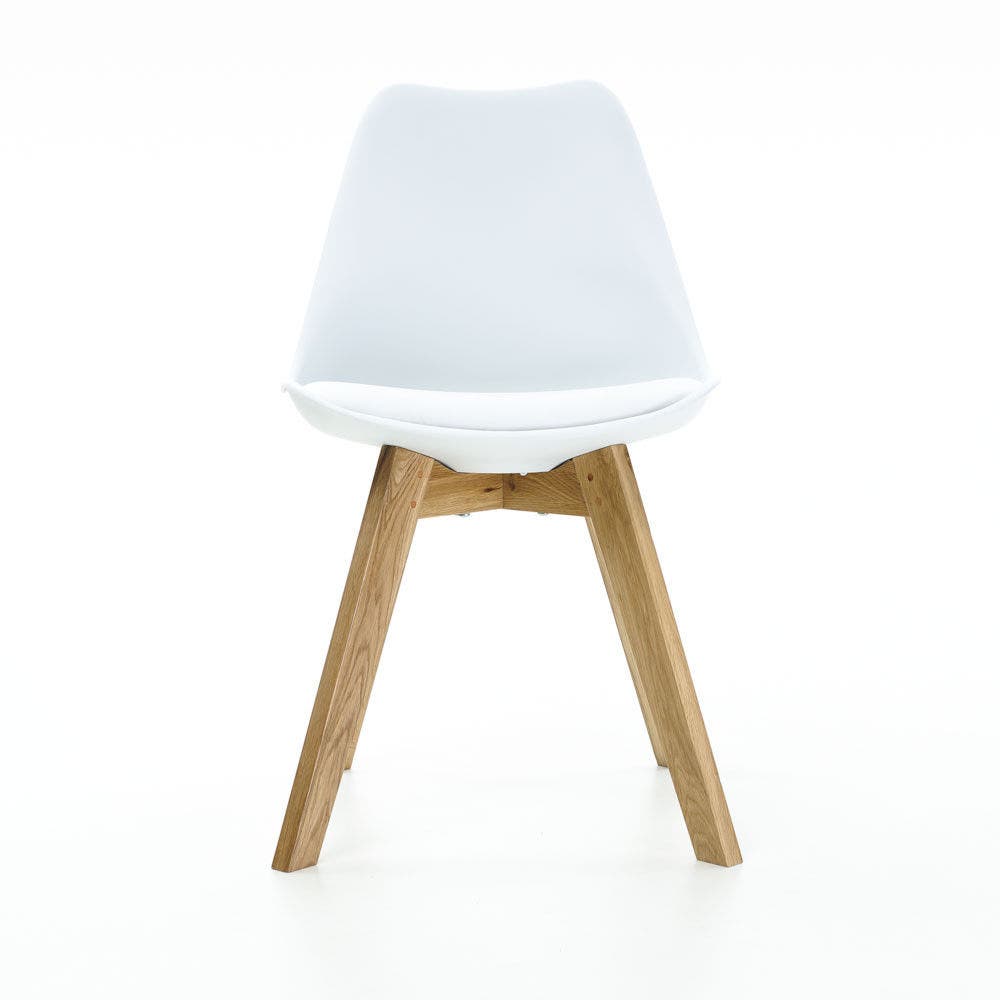 De zitting is gemaakt van kunststof en is bekleed met een kunstleren zitting die matcht met de kleur van de stoel. Ondersteund door het eikenhouten onderstel geniet je in de Madera stoel een stevige, comfortabele zit. Nu leverbaar in verschillende kleuren: wit, lichtgrijs, donkergrijs en zwart. Ook in donkergrijs kunstleer en cognac kunstleer. Het onderstel is verkrijgbaar in naturel en blackstained eikenhout.