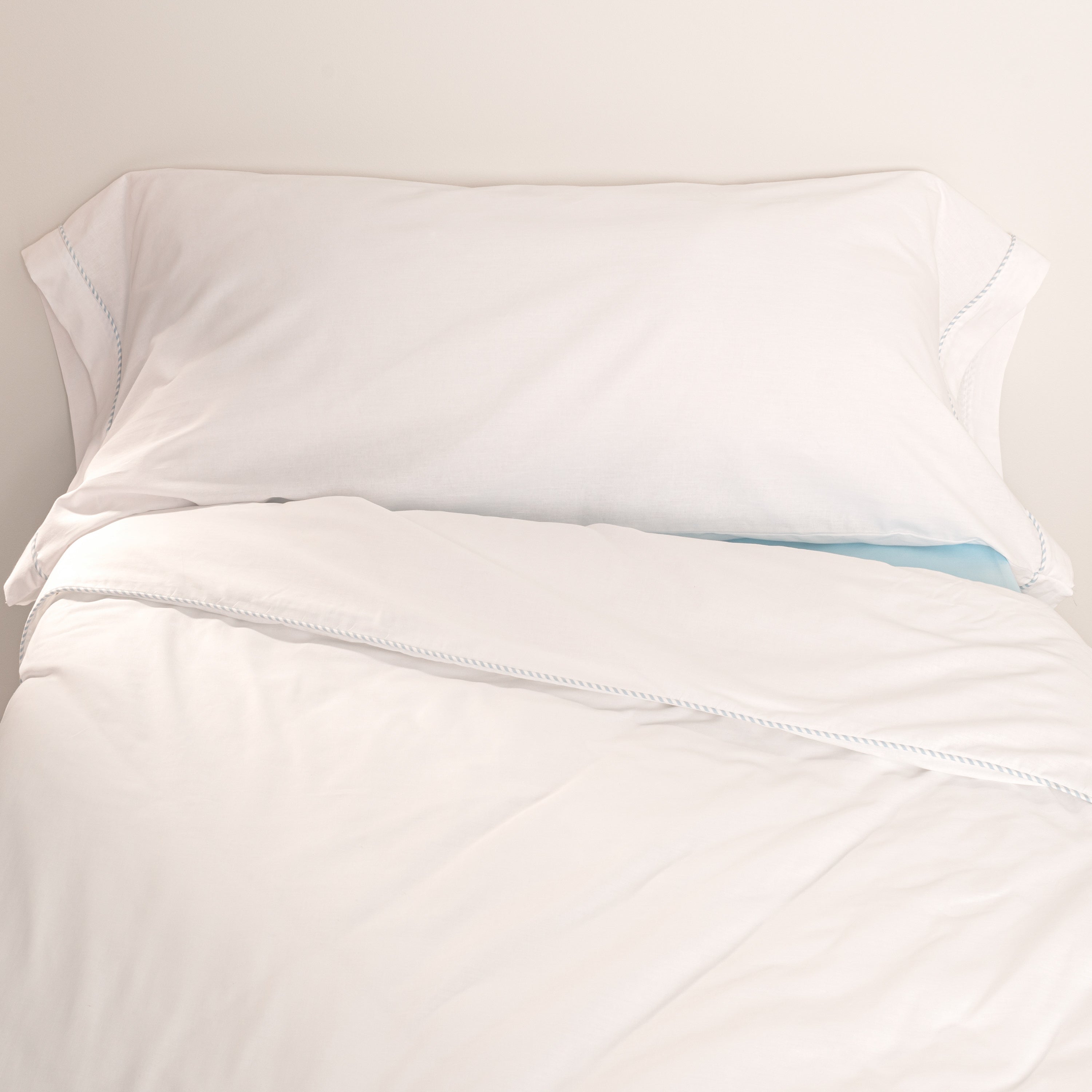 De tweedelige Essential kinderdekbedovertrekset in blauw heeft een charme die ligt in zijn eenvoud: wit met een gekleurde biaisband. Deze dekbedovertrekset is gemaakt van 100% katoen met 150 draden, perfect voor comfort en zachtheid het hele seizoen door. Het kan ook gemakkelijk worden verwisseld op wasdag dankzij de plastic drukknopen. Deze tijdloze klassieker past bij alle stijlen en kamertypes en voegt een vleugje elegantie toe aan elke ruimte - een perfecte keuze om een gezellige omgeving te creëren! Beddengoed niet inbegrepen.