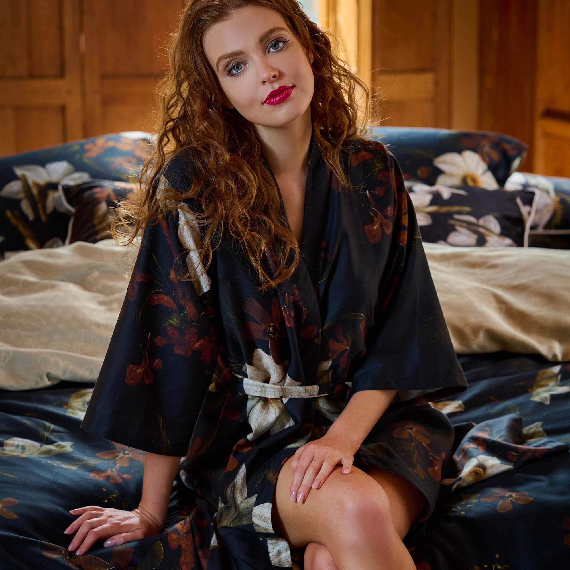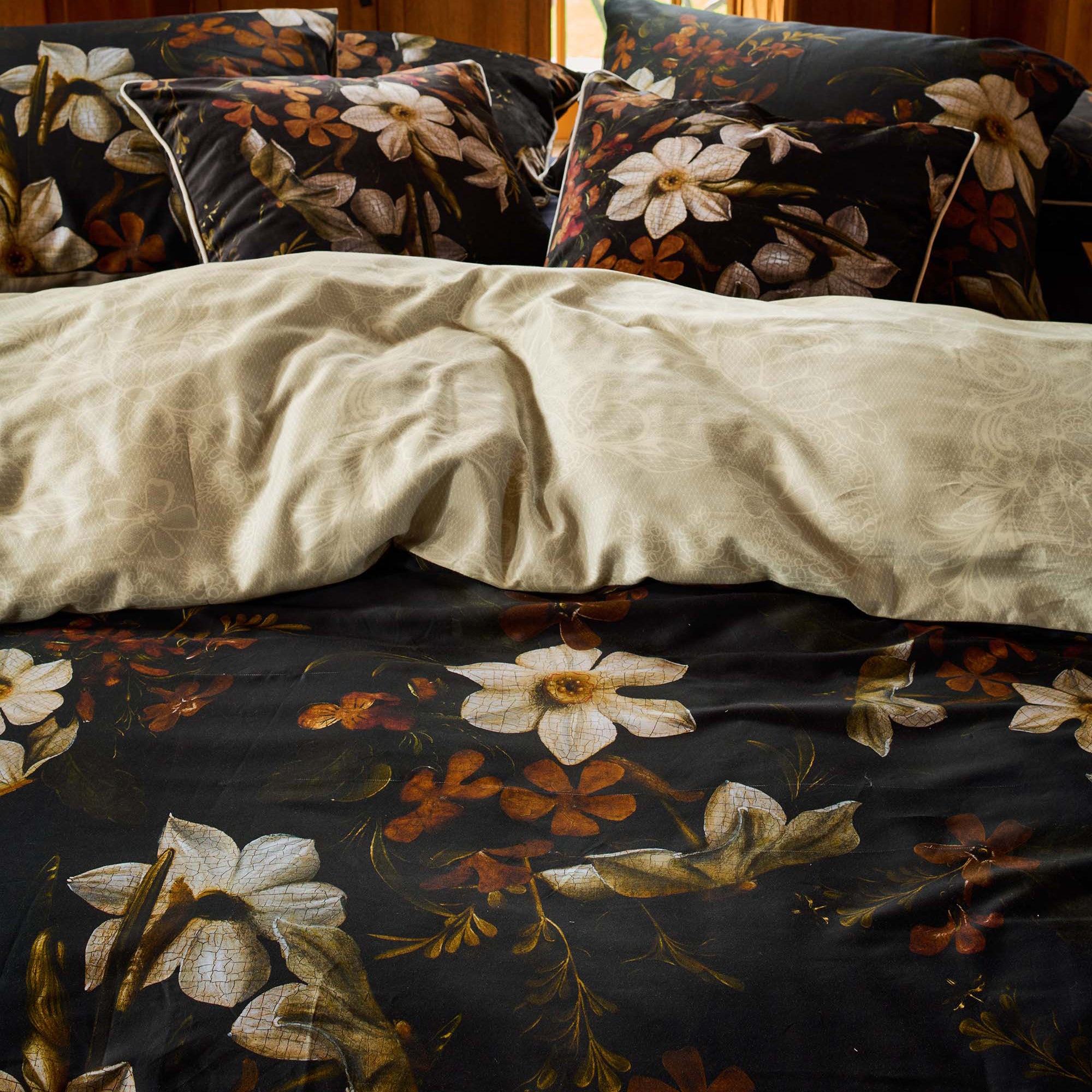 Het Essenza Daffodils Reunited dekbedovertrek heeft op de voorzijde bloemen op een donkere ondergrond, gebaseerd op het schilderij van Ludger Tom Ring de Jonge. Het kantpatroon op de andere zijde is gebaseerd op het portret van Aletta Hanemans.