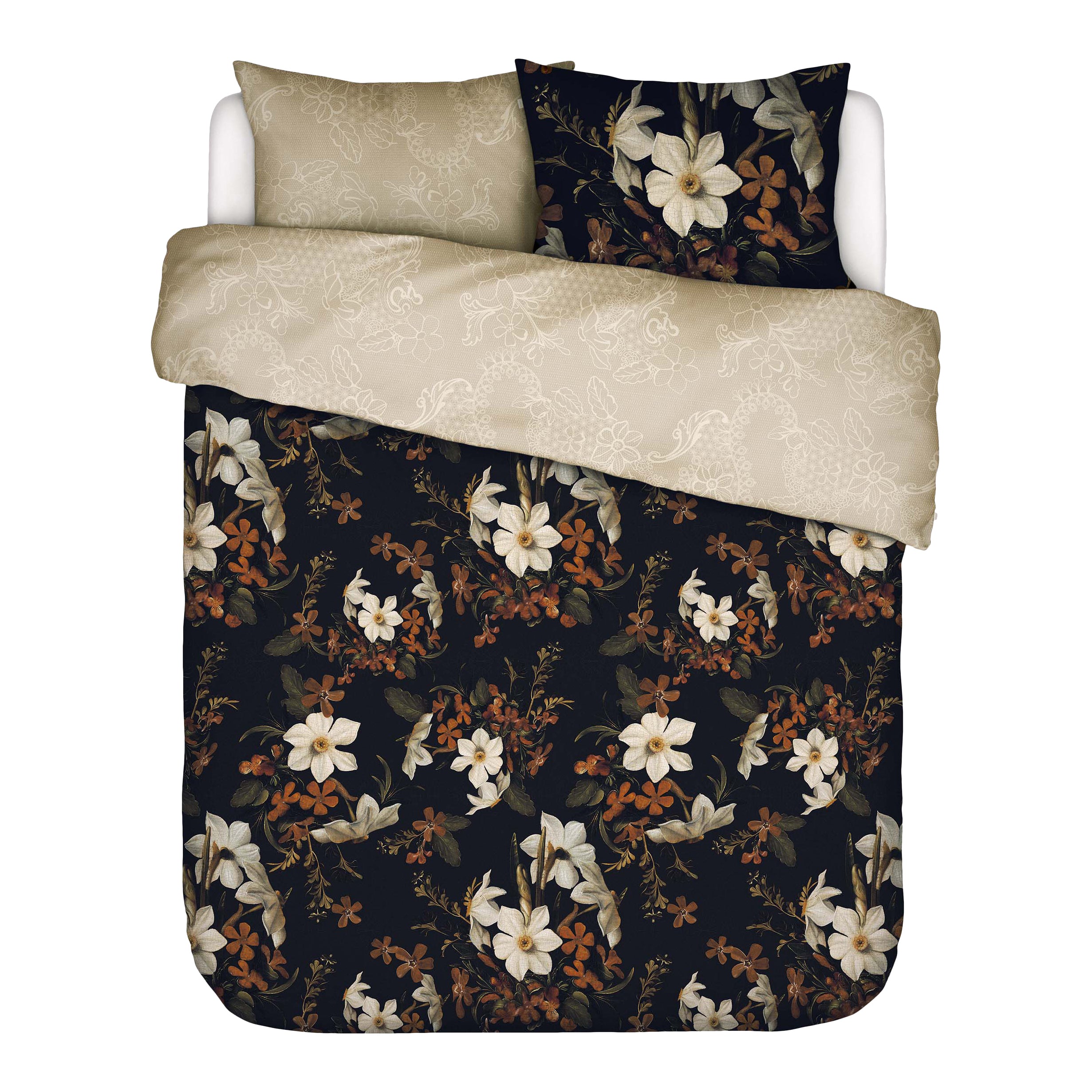 Het Essenza Daffodils Reunited dekbedovertrek heeft op de voorzijde bloemen op een donkere ondergrond, gebaseerd op het schilderij van Ludger Tom Ring de Jonge. Het kantpatroon op de andere zijde is gebaseerd op het portret van Aletta Hanemans.