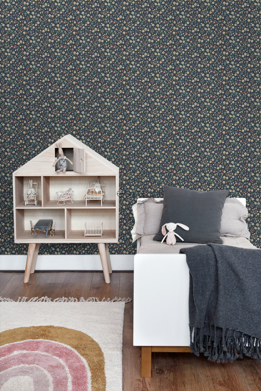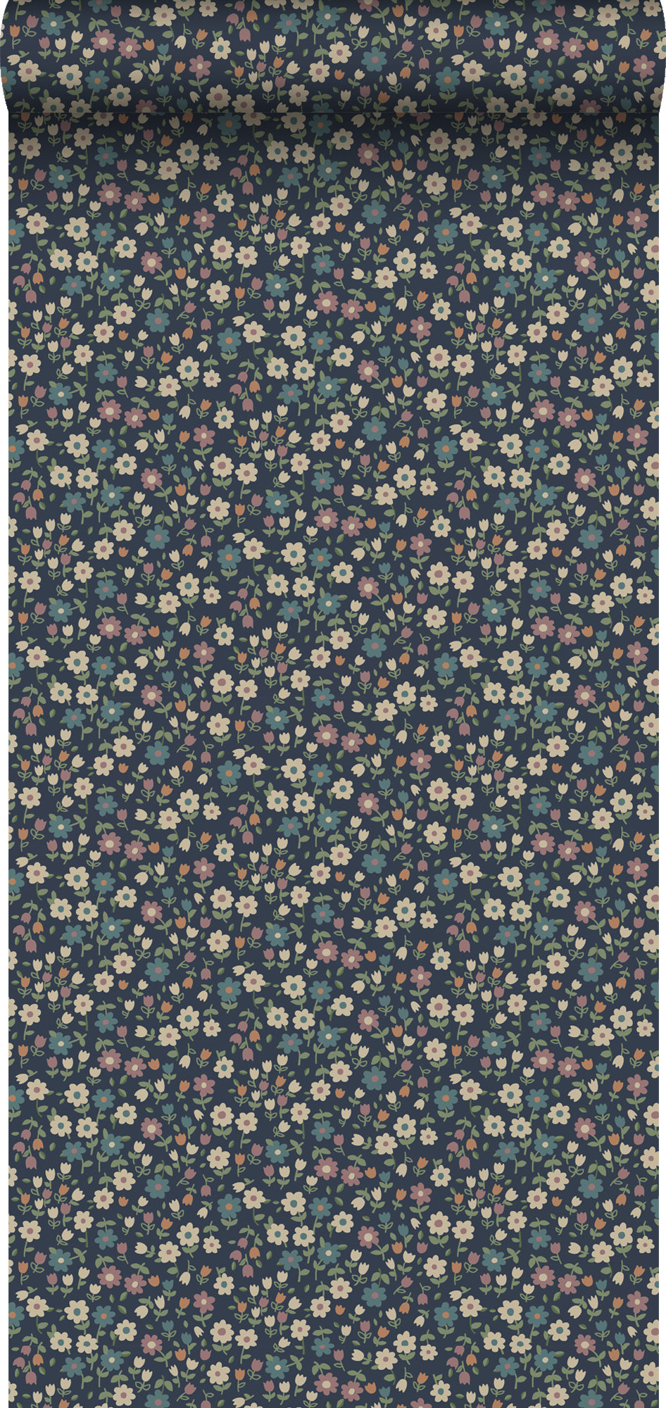 ESTAhome behang bloemetjes donkerblauw, lila roze en vergrijsd groen -