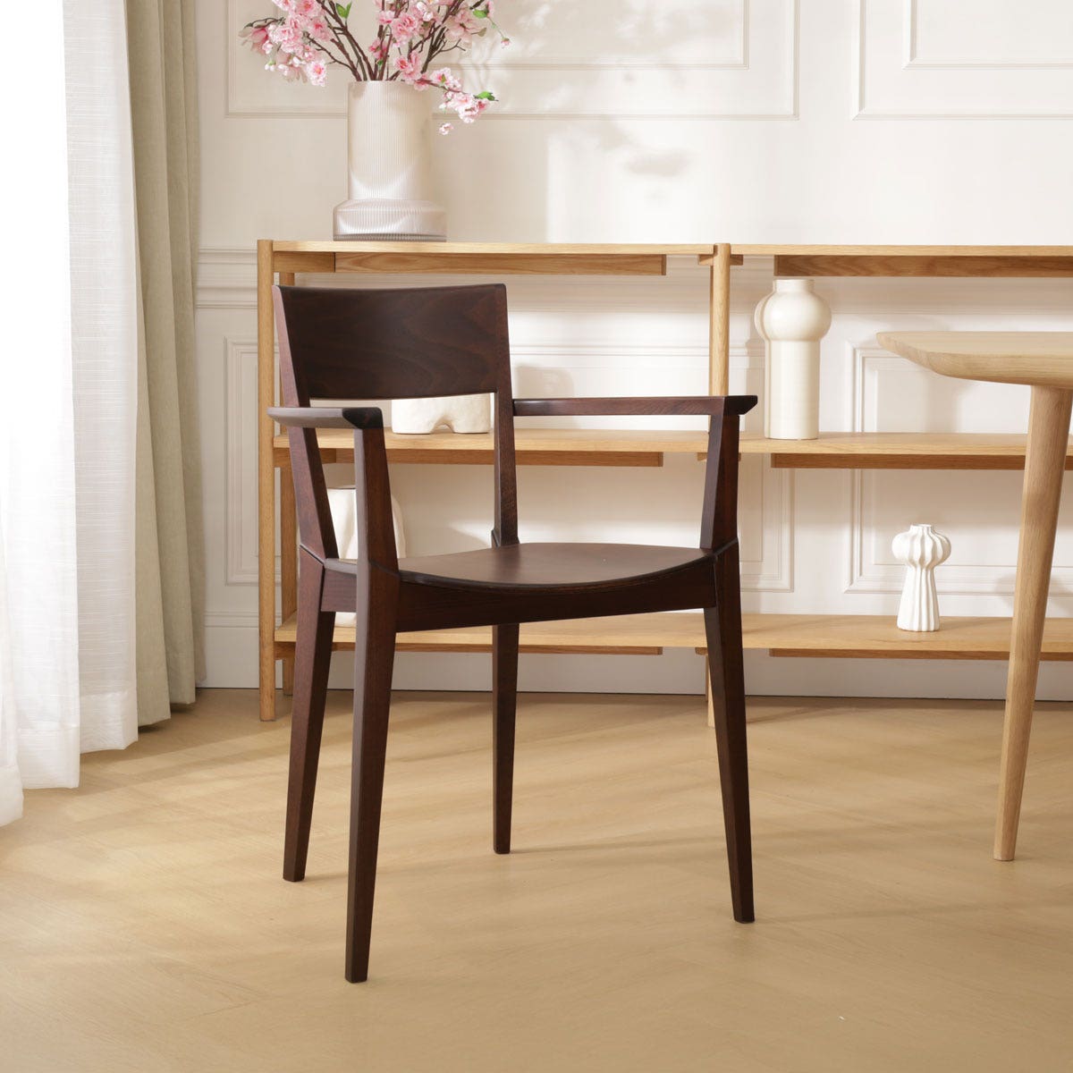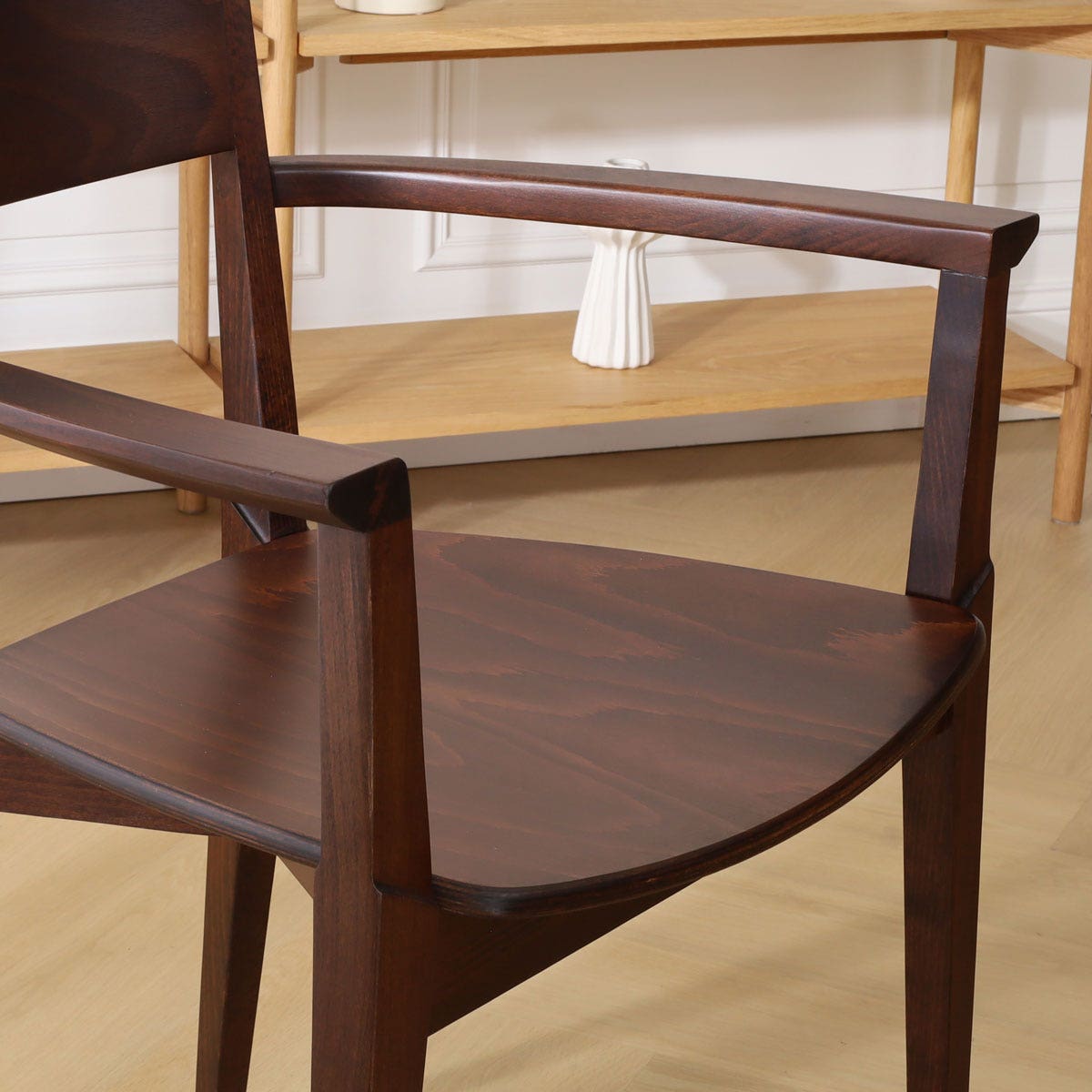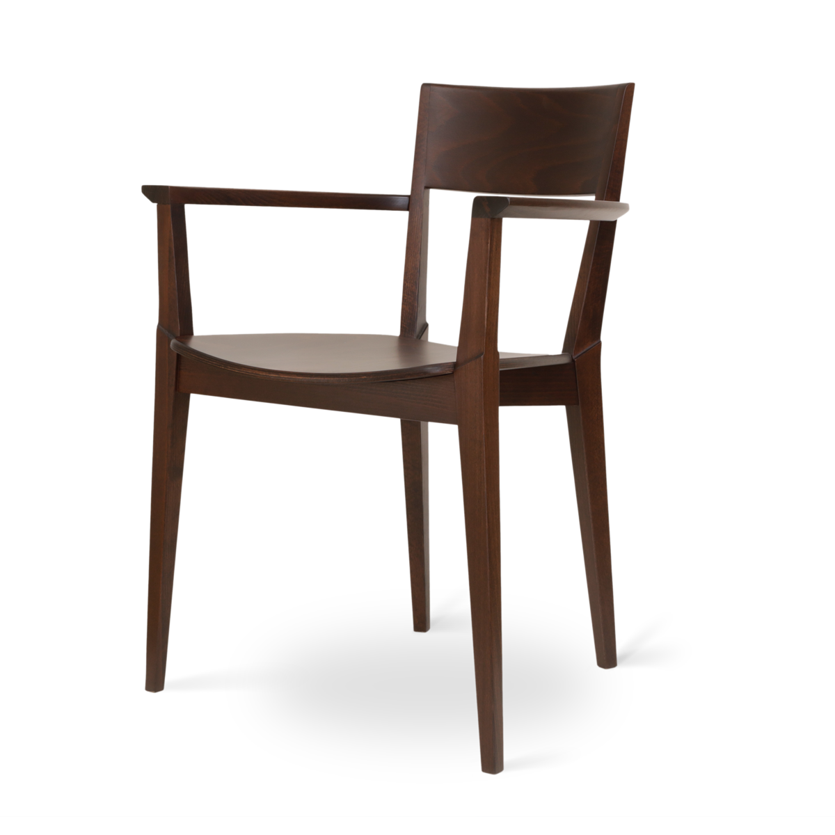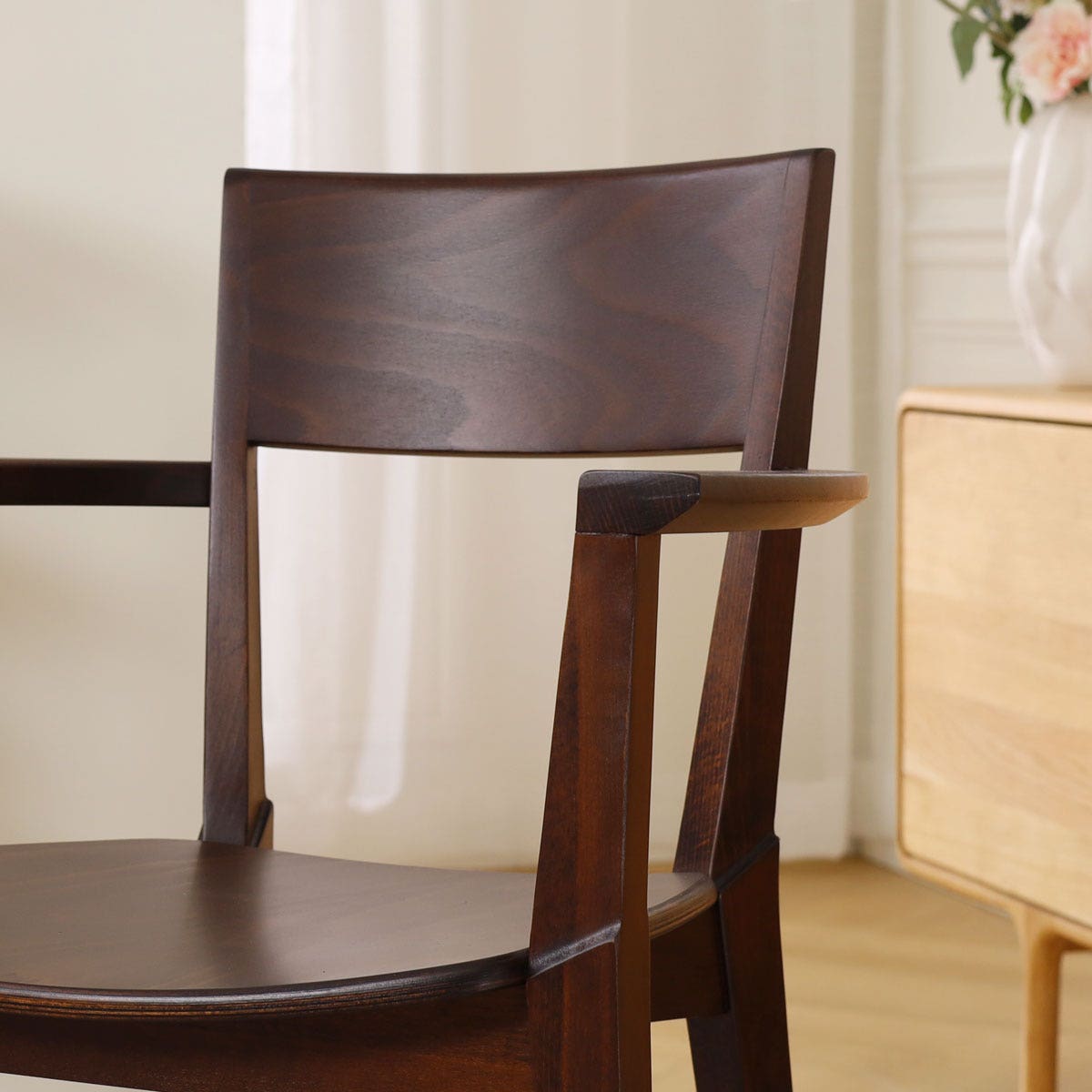 Luxe en comfort, dat straalt deze glanzende houten stoel met armleuningen uit. Opvallend aan deze stoel van Fameg is de combinatie van een smalle rugleuning met een brede zitting. Dankzij de slanke armleuningen en subtiele rugleuning behoudt deze houten stoel haar open karakter. De stoel zit heel comfortabel en geeft een goede steun voor rug en armen. Zittend op de Felda armstoel waan je je in een tijdperk waarin avondeten nog dineren heette.