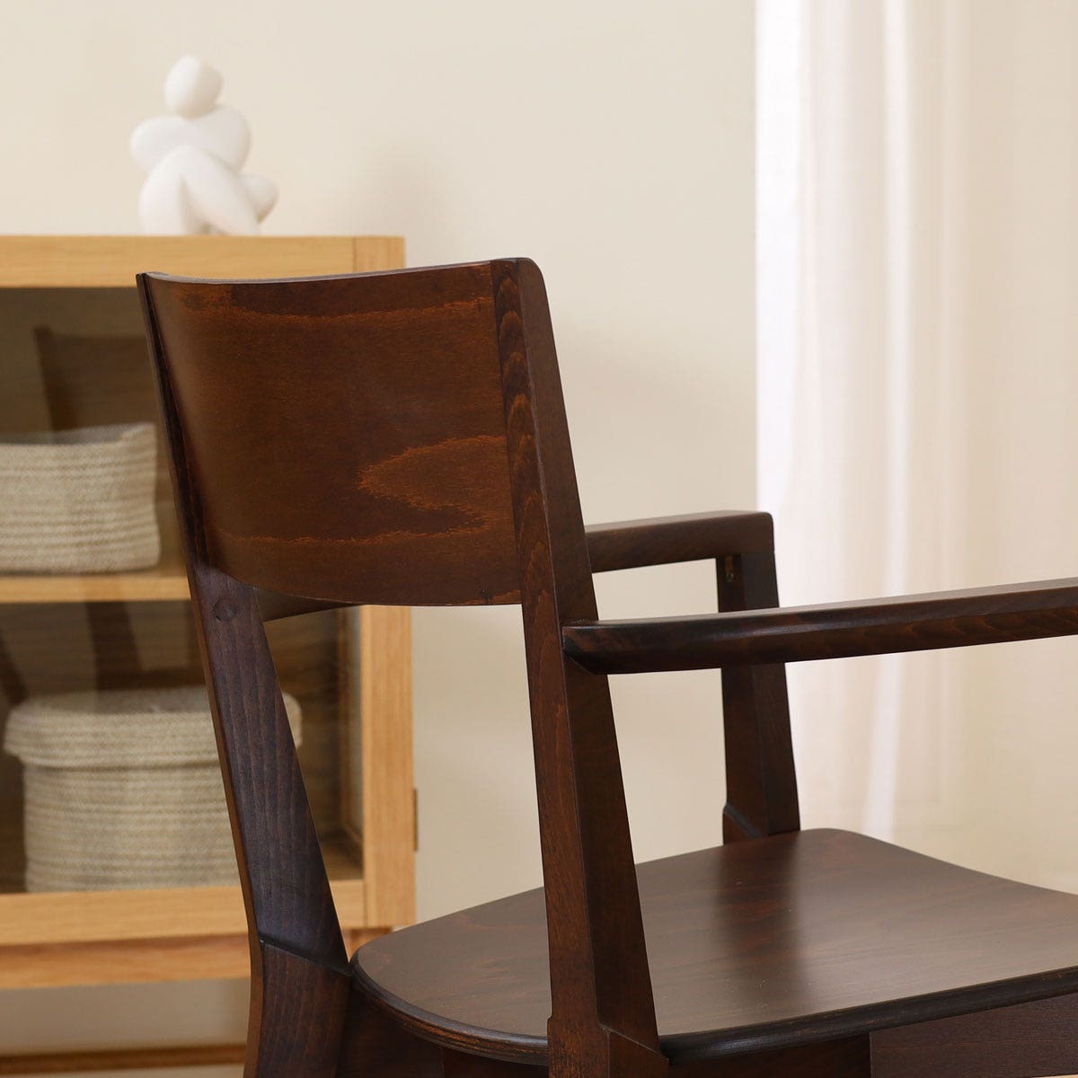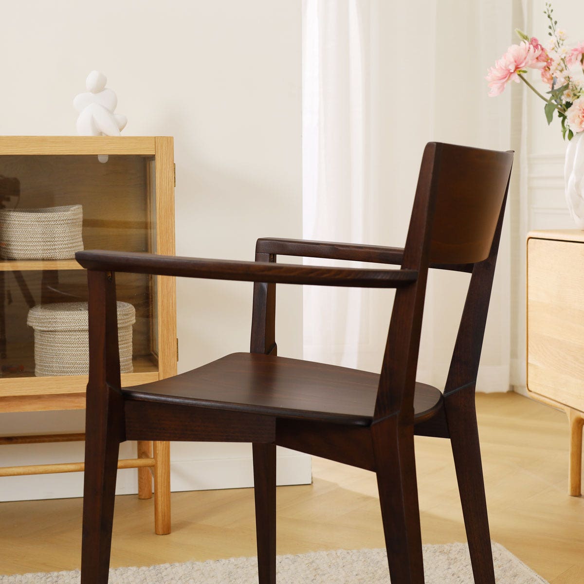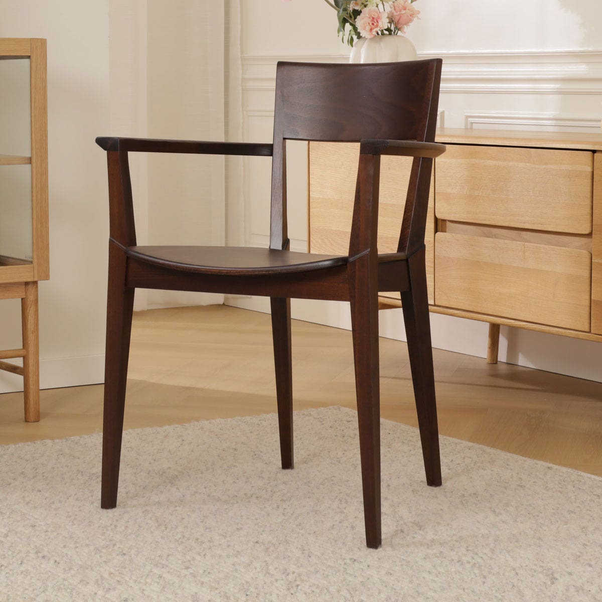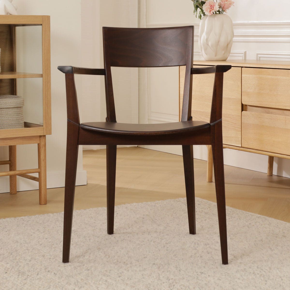 Luxe en comfort, dat straalt deze glanzende houten stoel met armleuningen uit. Opvallend aan deze stoel van Fameg is de combinatie van een smalle rugleuning met een brede zitting. Dankzij de slanke armleuningen en subtiele rugleuning behoudt deze houten stoel haar open karakter. De stoel zit heel comfortabel en geeft een goede steun voor rug en armen. Zittend op de Felda armstoel waan je je in een tijdperk waarin avondeten nog dineren heette.