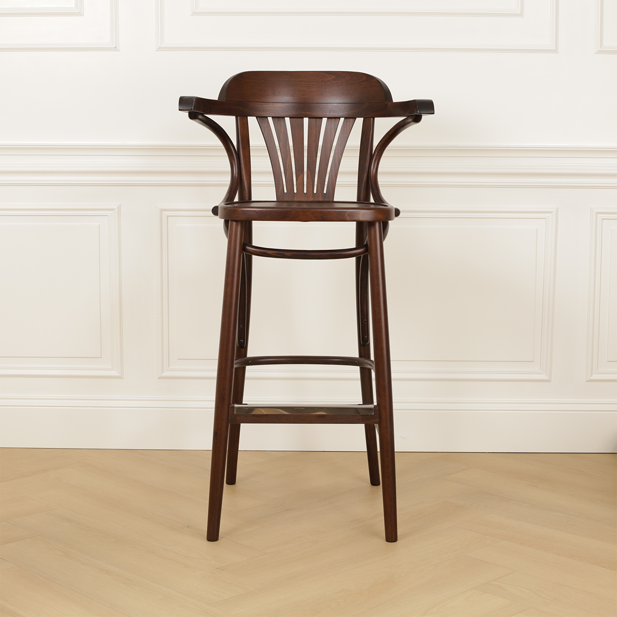 Het ontwerp is geïnspireerd op de traditionele bistrostijl, maar krijgt door de gebogen houten lijnen en de walnootkleurige afwerking een warme, luxe uitstraling. De hoge rugleuning met sierlijke spijlen en de geïntegreerde armleuningen zorgen voor extra comfort, zodat je moeiteloos urenlang aan de bar kunt zitten. Met een zithoogte van 75 cm is de Jos barkruk ideaal voor hoge bartafels of een keukenbar. De stevige constructie van massief hout, gecombineerd met de voetensteun, maakt dit een duurzame en comfortabele keuze die perfect tot zijn recht komt in zowel moderne als klassieke interieurs.