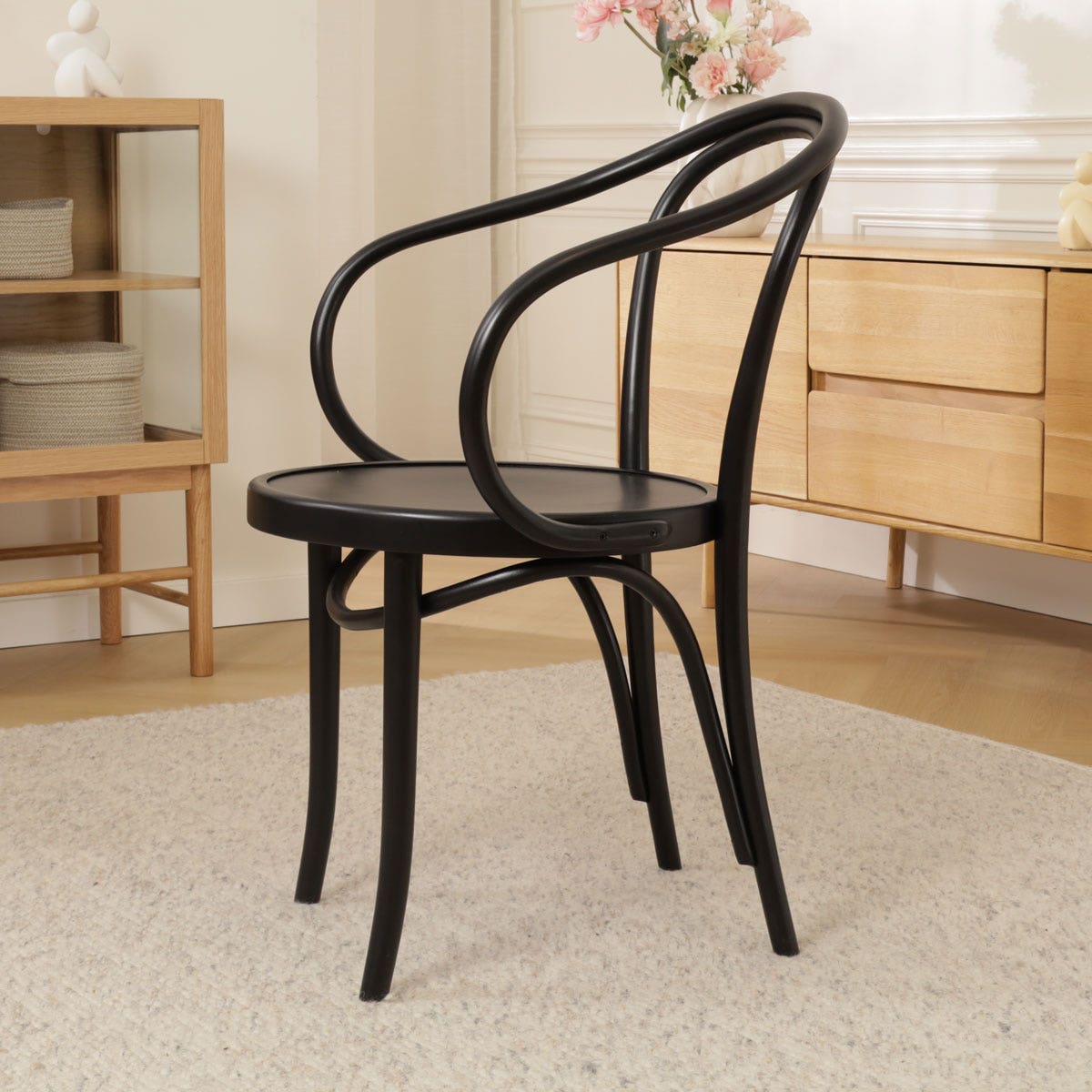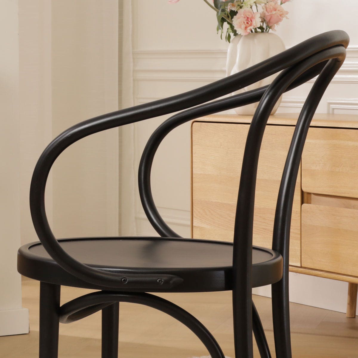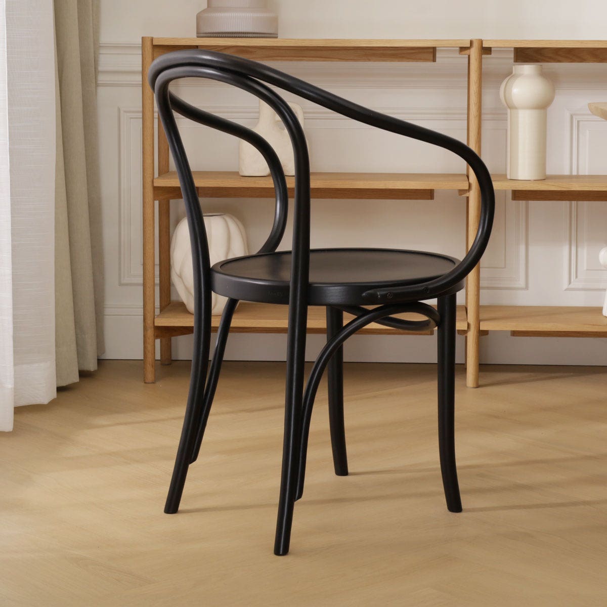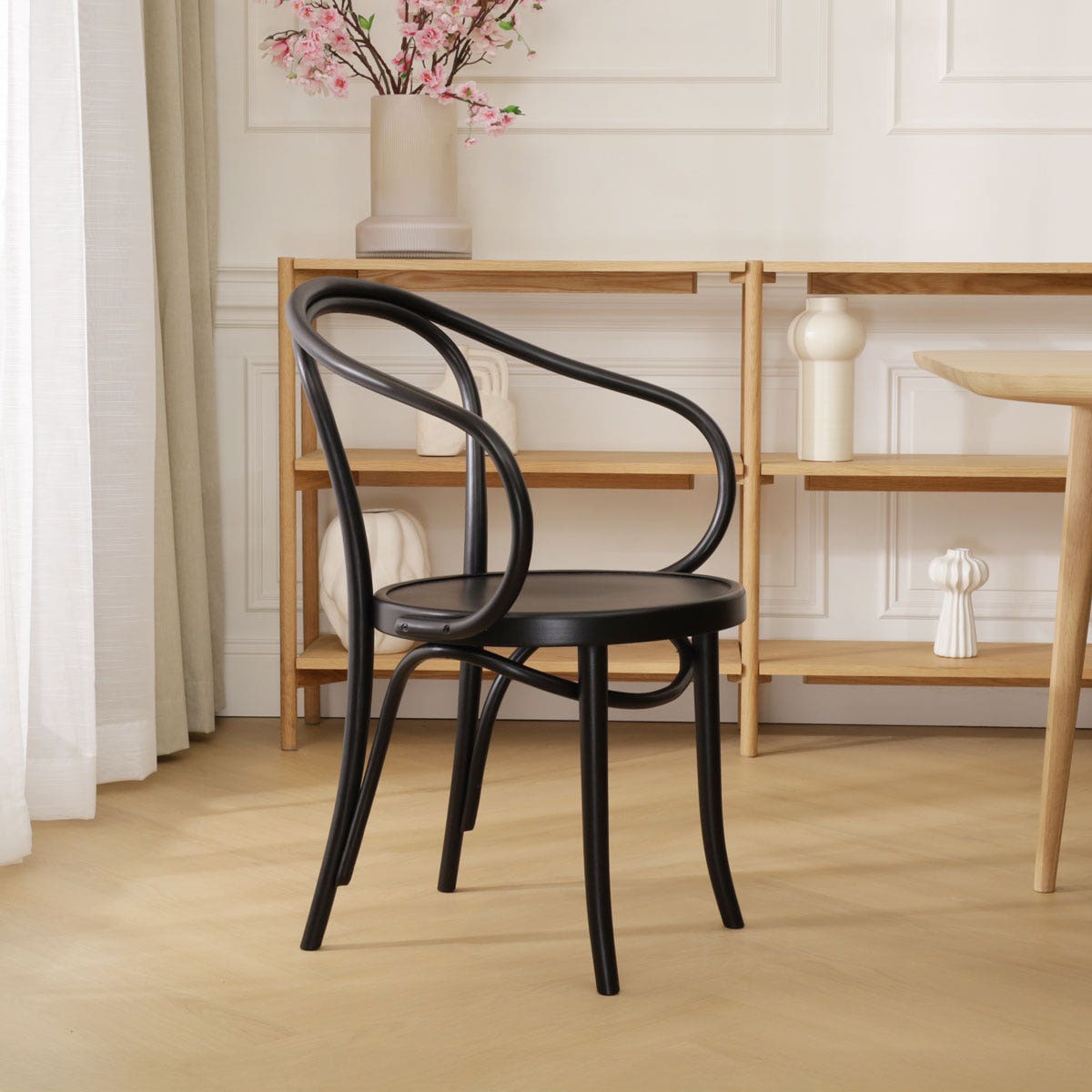 Deze bijzondere, tijdloze klassieker van Thonet heeft comfortabele armleuningen en een rond zitvlak. De zwierige lijnen en luchtige uitstraling van deze buighouten stoel maken hem al decennialang favoriet. Als je goed kijkt, zie je in deze armstoel de vormen van de iconische Thonet No.18 eetkamerstoel terugkomen. De twee klassiekers zijn ook heel mooi met elkaar te combineren. Het luchtige design maakt de Venice No.9 armstoel zeer geschikt voor restaurants en cafes, maar ook voor een gezellig hoekje. De kunstzinnige, organische vormen van deze armstoel maken hem al 100 jaar razend populair. De beroemde Zwitserse architect Le Corbusier noemde hem adellijk. Andere fans waren kunstenaars als Renoir en Toulouse-Lautrec, die deze Thonet stoel regelmatig lieten figureren in hun schilderijen.