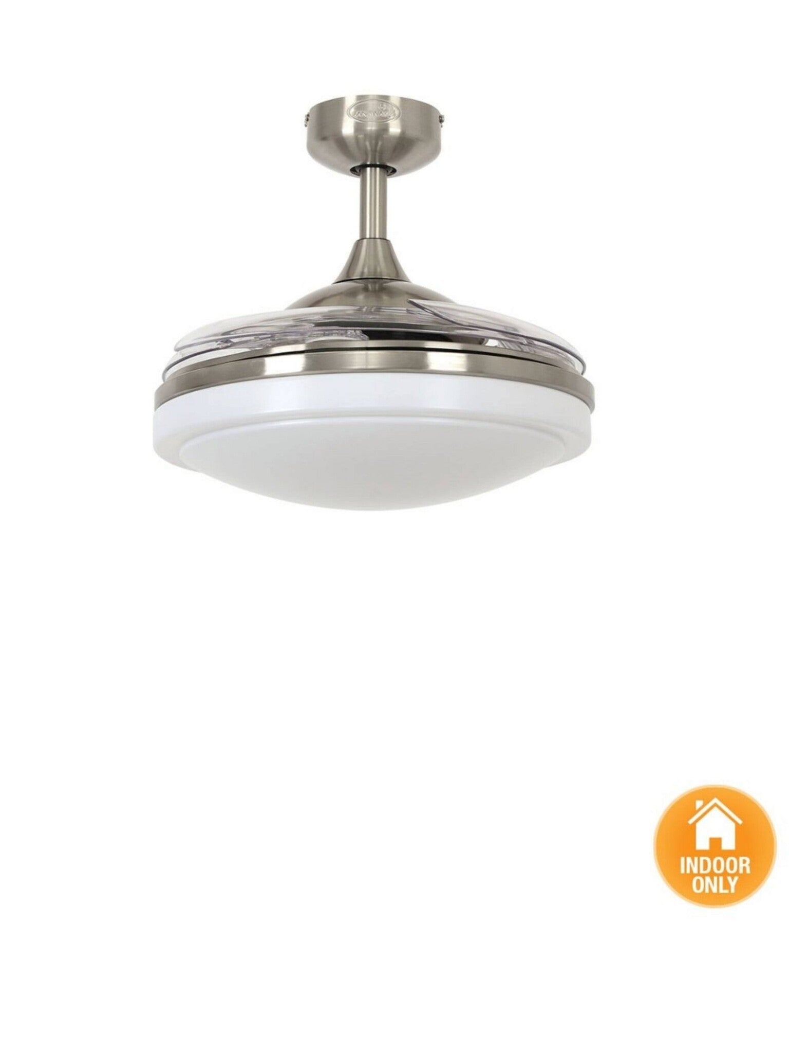 De FANAWAY Evora plafondventilator is uitgerust met een innovatief in- en uitschuifmechanisme. De 4 bladen bewegen uit de behuizing of worden met afstandsbediening weer ingeschoven, waardoor de ventilator verandert in een plafondlamp. Ook het ontwerp inspireert. Op de stalen body zitten vier bladen van transparant polycarbonaat. Het licht schijnt vanuit een matglazen behuizing in het midden van de ventilator. Voor de twee E27 fittingen kun je lampen gebruiken tot maximaal 20 watt.