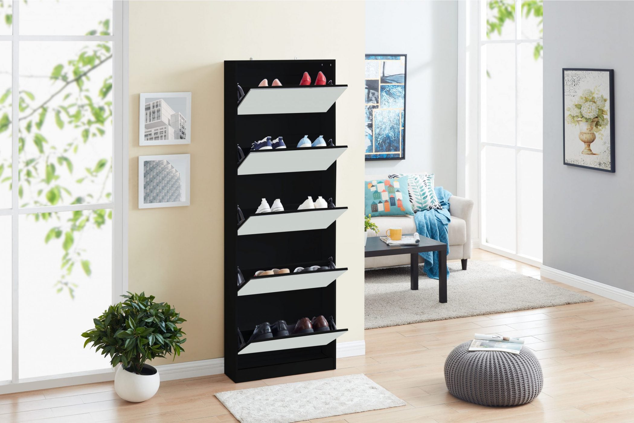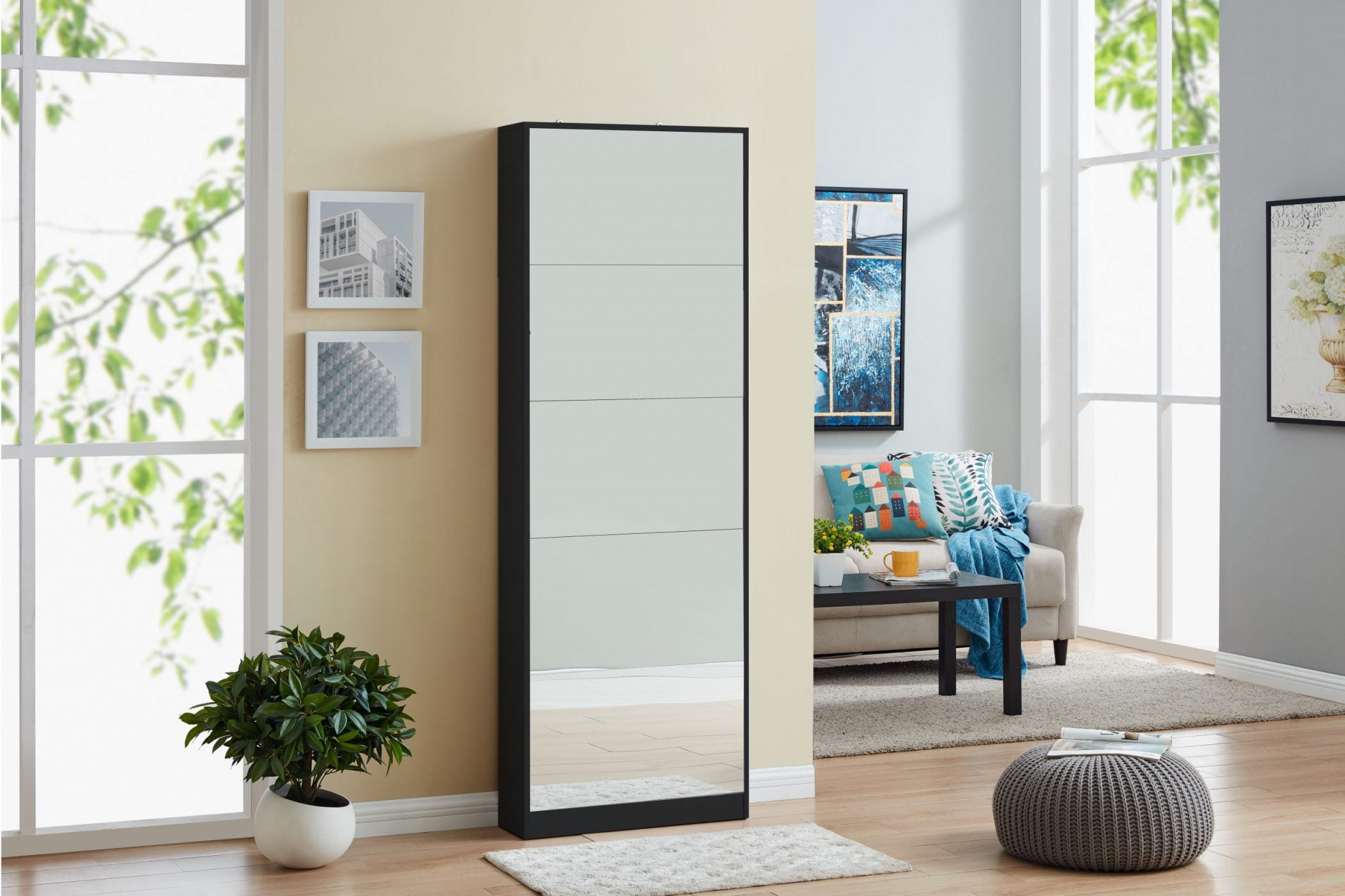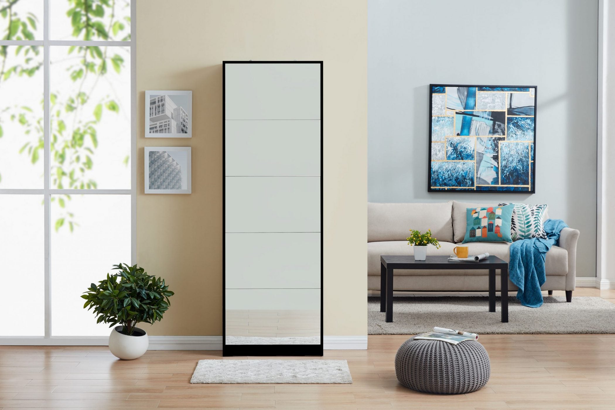 Aan schoenen hebben we hedendaags nooit genoeg. We kennen het bijna allemaal wel, schoenen die door het huis slingeren. De schoenenkast van Feel furniture biedt de oplossing voor uw probleem. De schoenenkast bevat 5 laden met op elke een spiegel bevestigd, de schoenenkast in zijn geheel functioneert ook nog als een volledige spiegel waarbij u kunt kijken hoe de schoenen bij uw outfit passen.Efficiënt De schoenenkast neemt weinig ruimte in beslag en er passen gemiddeld 20 paar schoenen in. Uw schoenen krijgen een luxe opberg plek en de kast voegt een mooie decoratie in uw huis toe, een win-win situatie dus.SchitterendMet het moderne design is de schoenenkast een plaatje voor het oog. De mooi afgewerkte panelen en het totaalplaatje zullen aandacht opwekken bij uw bezoekers.De schoenenkast is te verkrijgen in 3 verschillende kleuren: wit, bruin en zwart.Deze kast is geschikt voor schoenen tot en met schoenmaat 46.