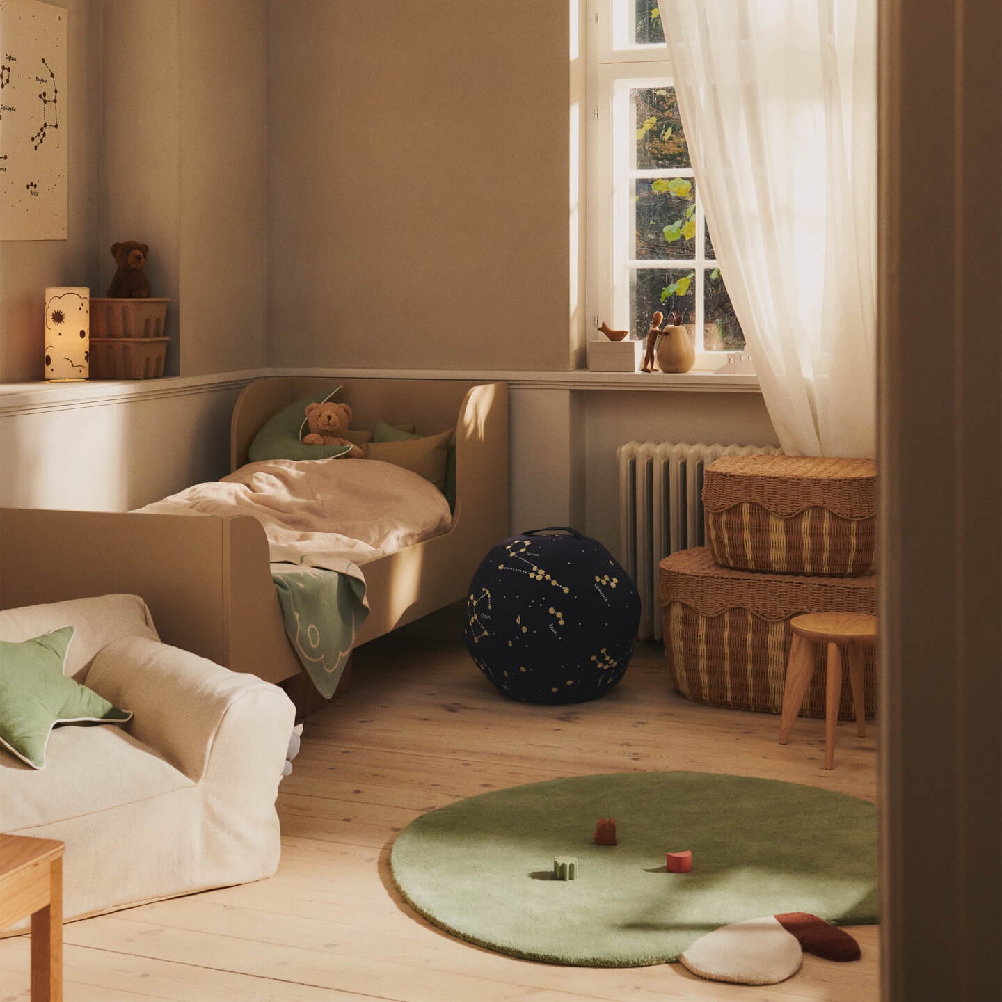 - Ronde poef met geborduurde en bedrukte sterrenbeelden