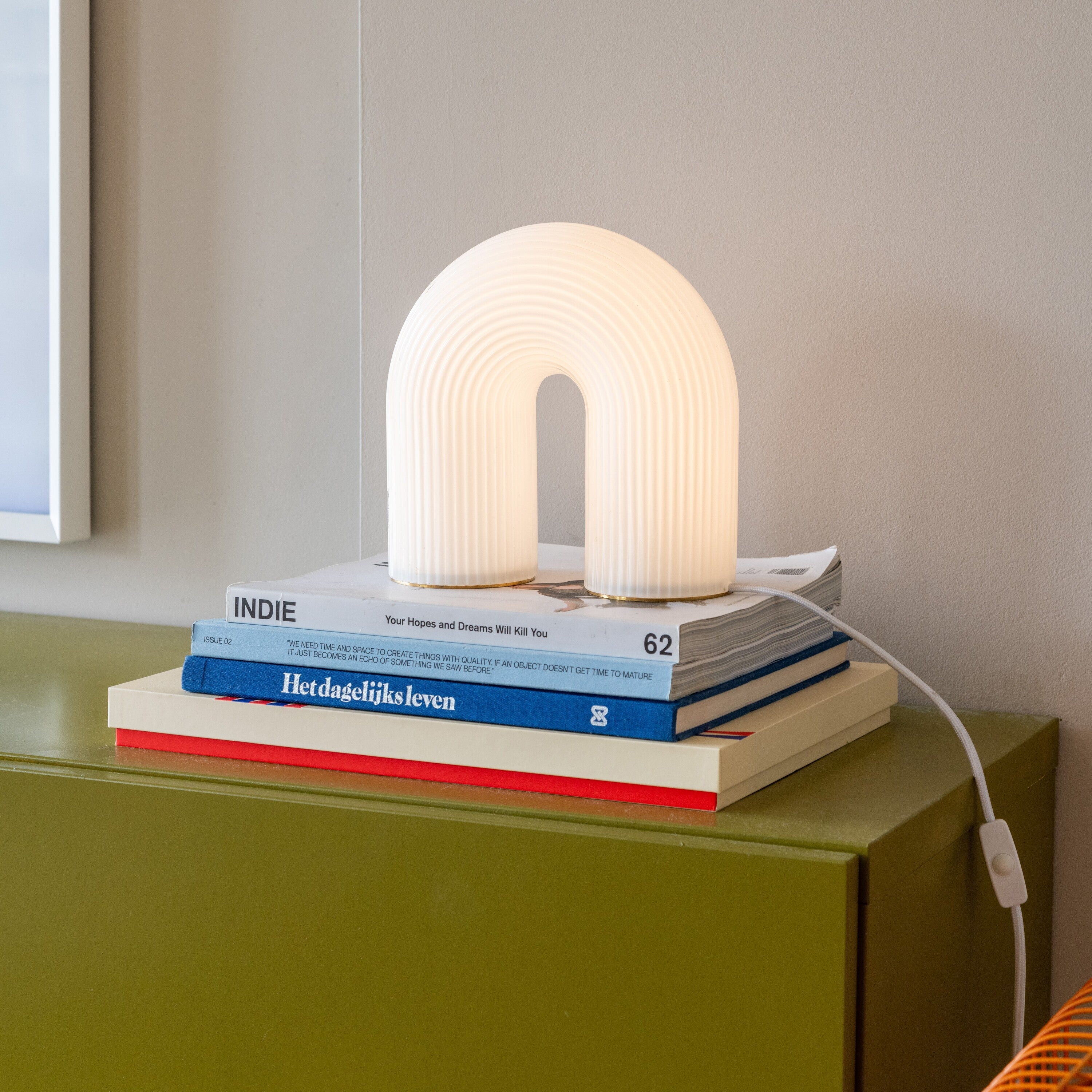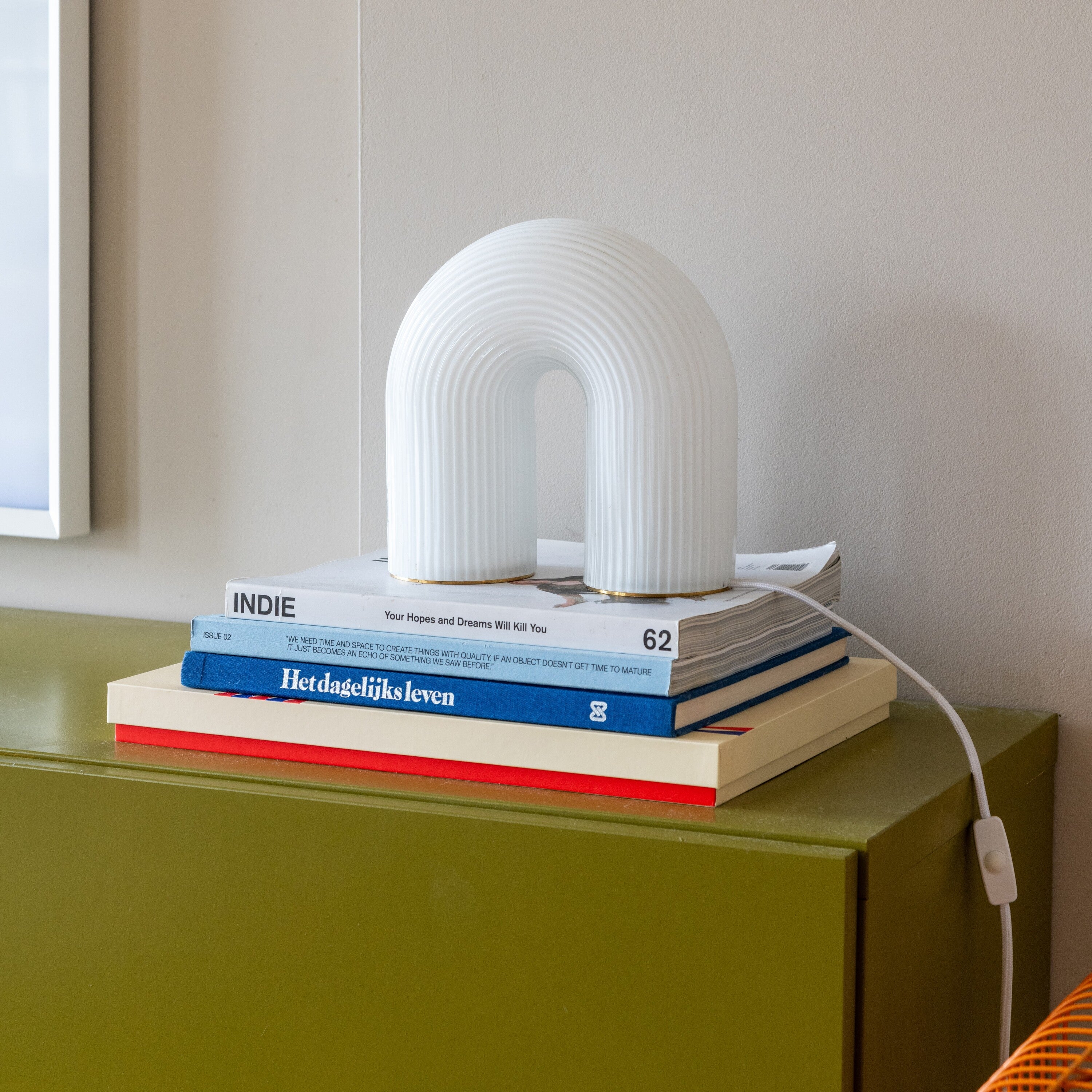 - De lamp is gemaakt van geribbeld melkglas
