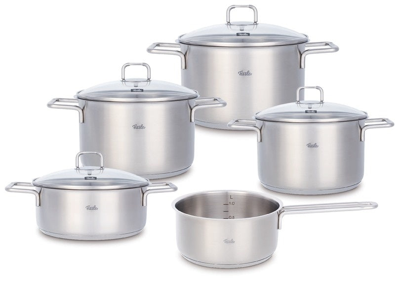 Deze luxe pannenset van Fissler bestaat uit vijf delen: