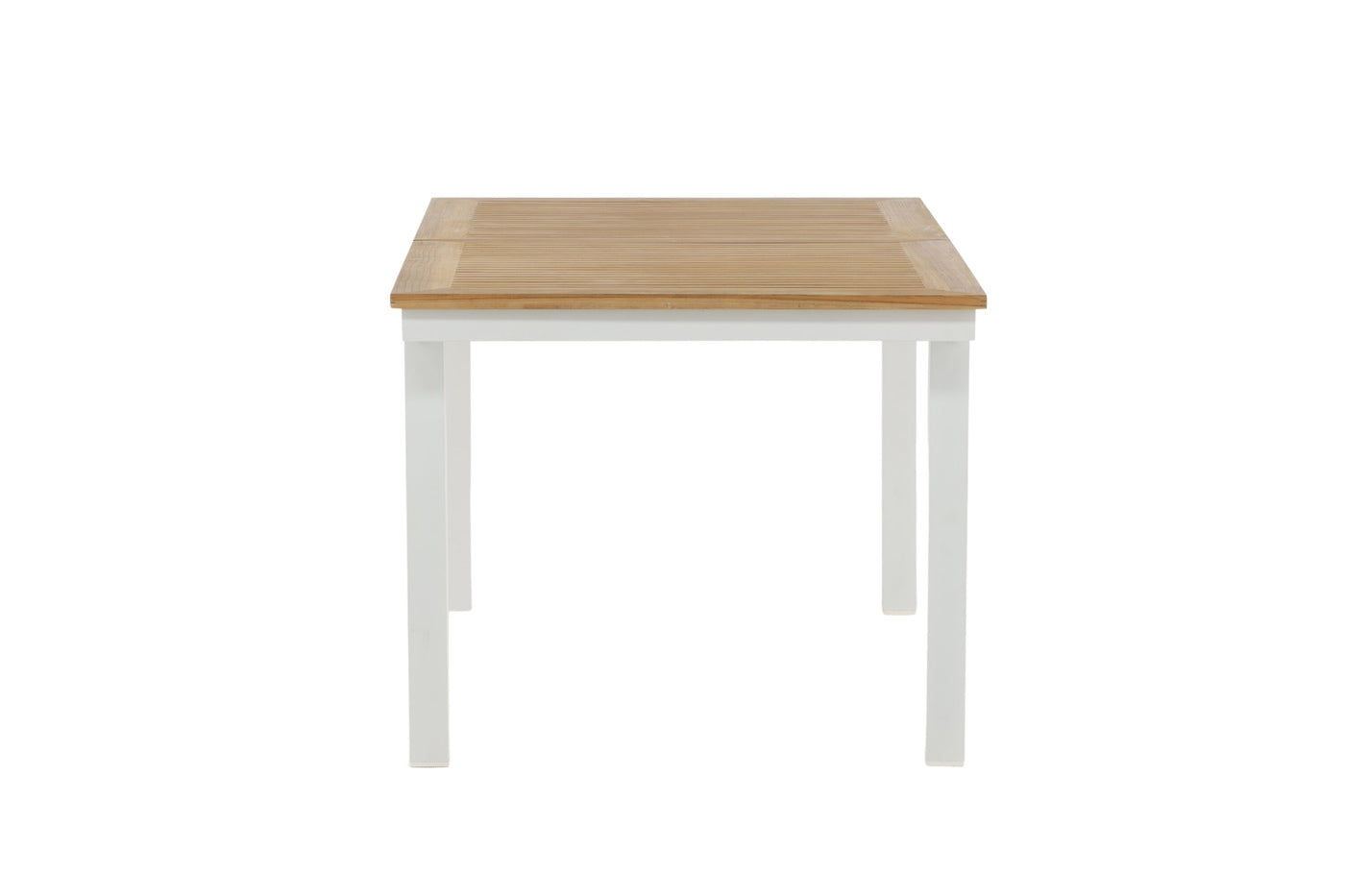 Materiaal: Het tafelblad is vervaardigd uit teakhout, bekend om zijn duurzaamheid en weerbestendigheid. Het onderstel is gemaakt van stevig aluminium, wat zorgt voor stabiliteit en een moderne uitstraling. Deze combinatie van materialen maakt de tafel zowel stijlvol als functioneel.