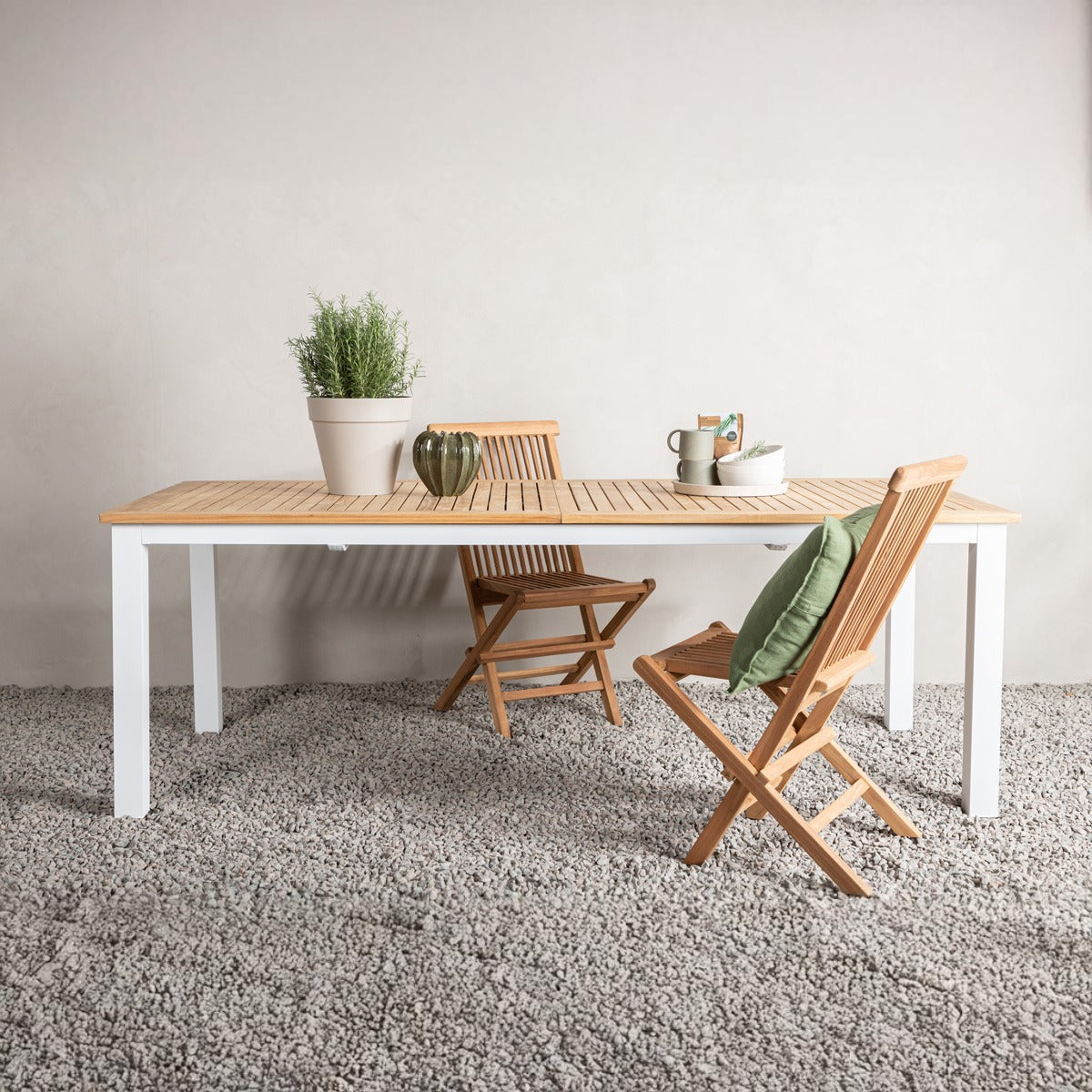 Materiaal: Het tafelblad is vervaardigd uit duurzaam teakhout, wat bekend staat om zijn robuustheid en weerbestendigheid. Het onderstel is gemaakt van stevig aluminium, wat zorgt voor stabiliteit en een moderne uitstraling. Deze combinatie van materialen maakt de tafel zowel functioneel als esthetisch aantrekkelijk.