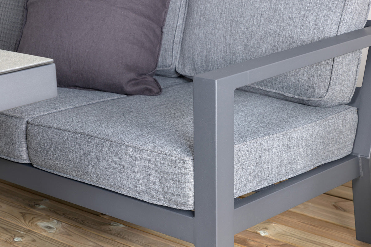 Materiaal: Het tafelblad van deze tuinset is gemaakt van duurzaam steen, terwijl het onderstel van stevig aluminium is. De zittingen zijn bekleed met een hoogwaardige stof/textiel, wat zorgt voor een comfortabele zitervaring. Deze combinatie van materialen maakt de set zowel stijlvol als weerbestendig.