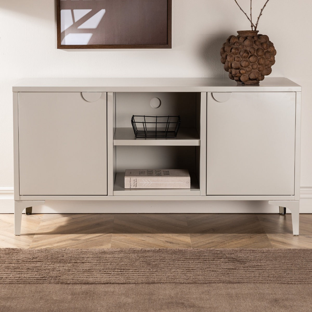 Ontdek het stijlvolle Fjôrd Tv-meubel Piring in een verfijnde beige kleur. Dit meubelstuk straalt de kenmerkende Scandinavische stijl uit en is vervaardigd uit hoogwaardig staal, wat zorgt voor een robuuste en duurzame constructie. De zachte beige tint voegt een warme en uitnodigende sfeer toe aan je interieur. Het tv-meubel biedt niet alleen een esthetische meerwaarde, maar is ook functioneel met zijn ruime opbergmogelijkheden. Het is de perfecte aanvulling voor elke moderne woonkamer en biedt een ideale plek om je televisie en andere media-apparatuur te plaatsen.