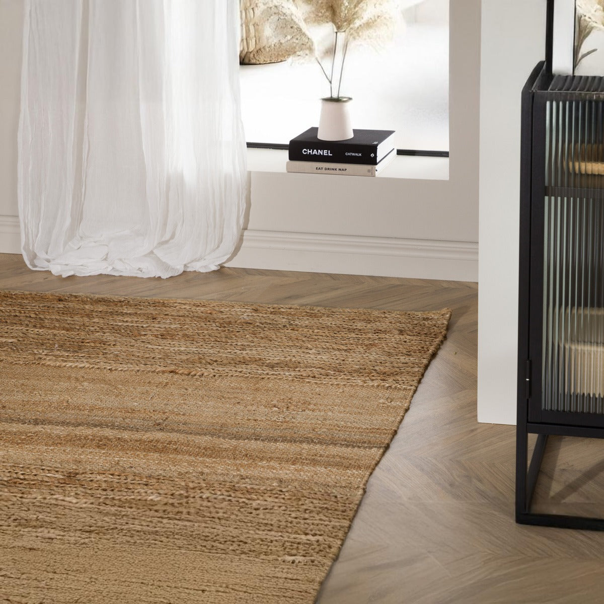 Materiaal: Het vloerkleed is vervaardigd uit jute, een natuurlijk materiaal dat bekend staat om zijn stevigheid en duurzaamheid. Jute is een uitstekende keuze voor vloerkleden, omdat het zowel milieuvriendelijk als slijtvast is, waardoor je lang van je aankoop kunt genieten.