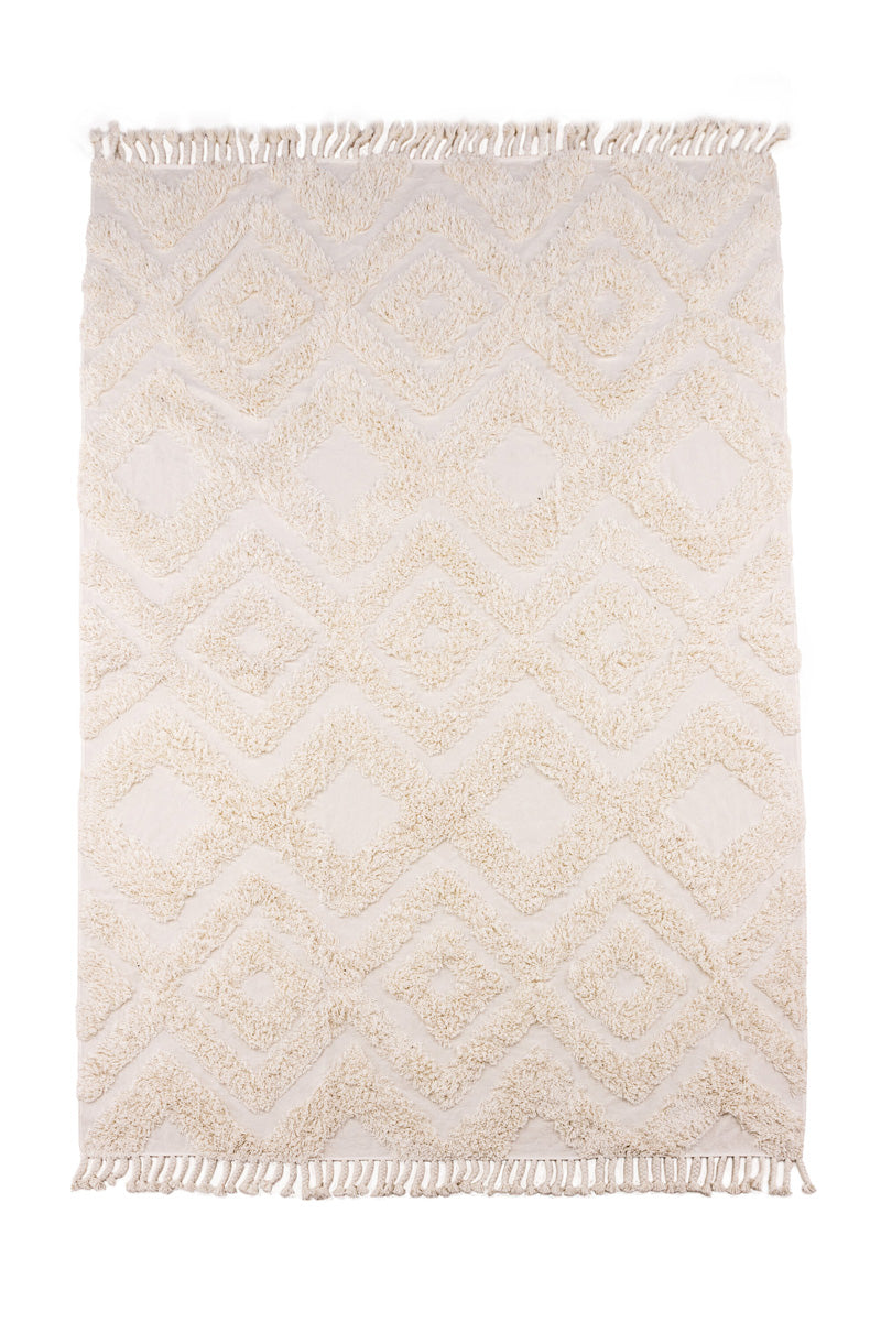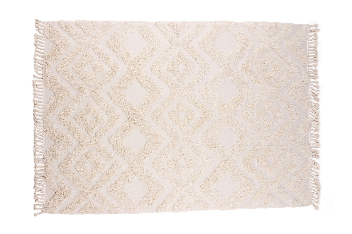 Materiaal: Het vloerkleed is vervaardigd uit katoen, een natuurlijk en ademend materiaal dat bekend staat om zijn duurzaamheid en zachtheid. Katoen is gemakkelijk te onderhouden en biedt een comfortabele textuur, ideaal voor dagelijks gebruik in huis.