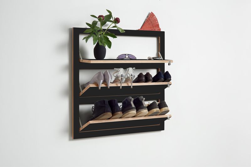Om bergen schoenen onder de kast te voorkomen, kunnen alle Fläpps-wandplanken met een kleine diepte nu met een eenvoudige truc worden omgebouwd tot schoenenplank. Door kleine magneten in de scharnierrail te plaatsen, openen de kleppen van de planken slechts 45 graden, waardoor je schoenen en andere spullen praktisch kunt opbergen die schuin moeten worden bewaard.