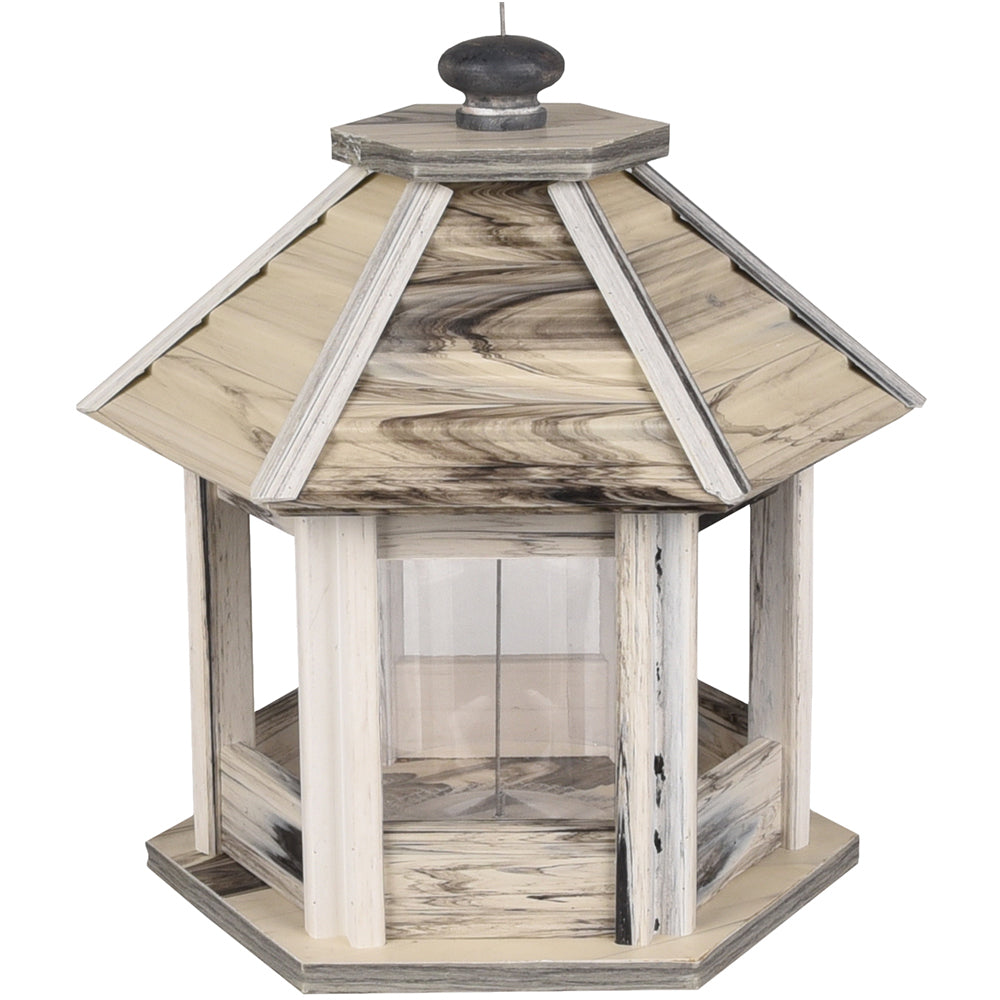 Dit voederhuis is gemaakt van hout in combinatie met kunststof in de kleurencombinatie grijs met wit. Het voederhuis is gemaakt van duurzaam en onderhoudsvrij materiaal. De silo heeft meerdere compartimenten die elk geschikt zijn om vogelzaad of zonnebloempitten in te doen. Doordat de silo doorzichtig is kunt u eenvoudig zien of de silo bijgevuld moet worden. Dit kan eenvoudig door de bovenkant te verwijderen. Door het ontwerp met een aflopend gedeelte wordt het vogelvoer beter verdeeld. Ook zorgen de afwateringsgaten ervoor dat het regenwater gemakkelijk kan weglopen, zodat het voer niet onder komt te staan. De voedersilo kan eenvoudig worden opgehangen met behulp van een ophangdraad aan de bovenzijde en heeft een afmeting van circa 30 x 30 x 30 centimeter (lxbxh).