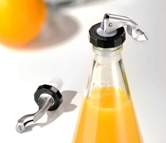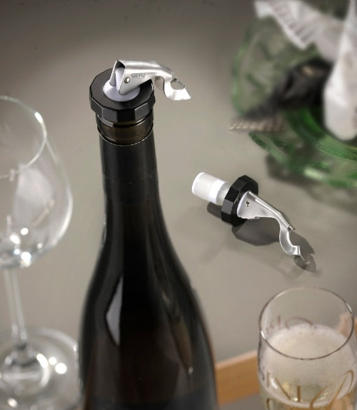 Deze 2 praktische flessenstoppen van Gefu zijn geschikt voor allerlei soorten flessen met een hals diameter tussen de 16,5 mm en 19,5 mm. De flessenstop verzegelt de flessen veilig en betrouwbaar zonder dat de inhoud van de fles kan ontsnappen. Dit doe je eenvoudig door de stop in de fles te plaatsen en de hendel opzij te drukken. In de hendel bevindt zich ook nog een handige flessenopener. Na gebruik kunnen de stoppen gereinigd worden in de vaatwasser.