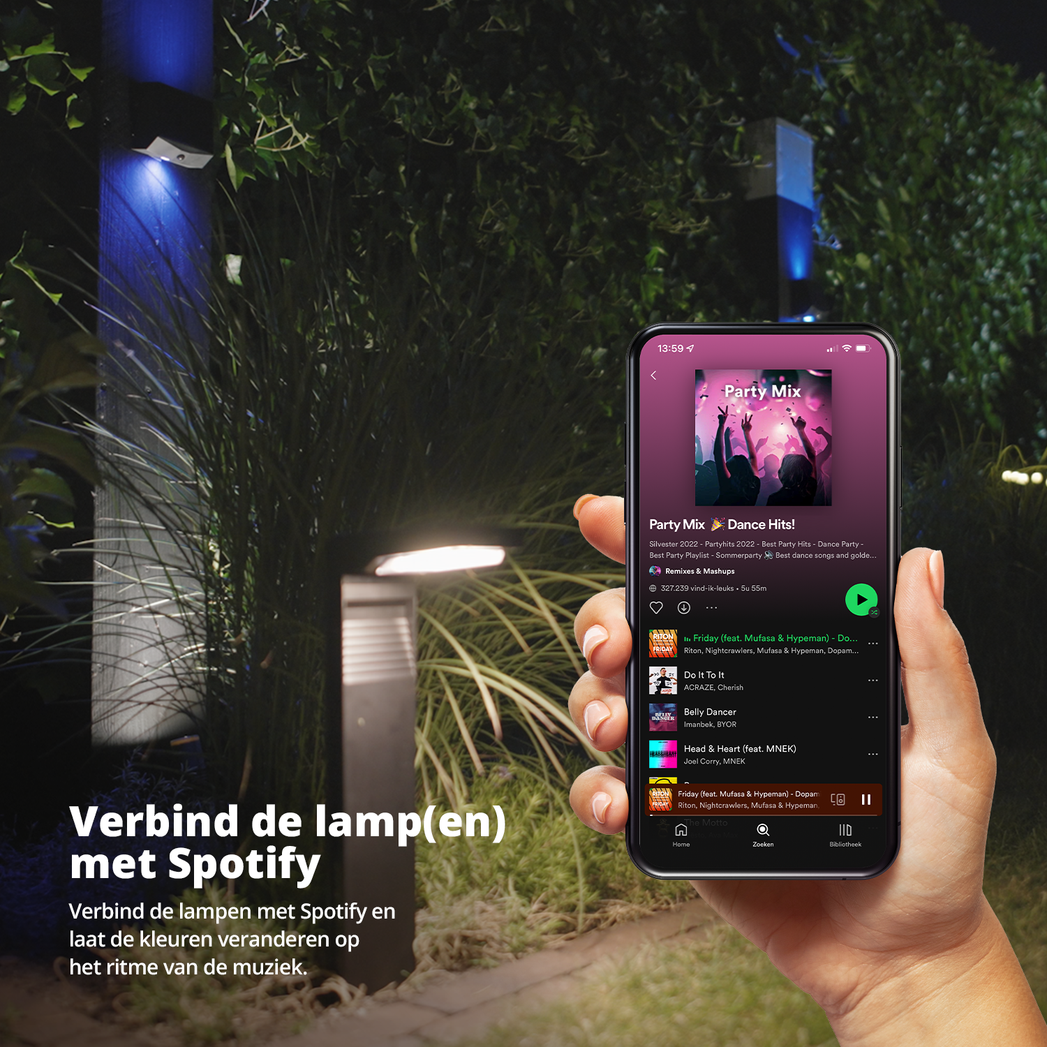 Verbind de lampen met Spotify en laat de kleuren veranderen op het ritme van de muziek. Een feestje in de tuin wordt nog gezelliger met de Gaia!