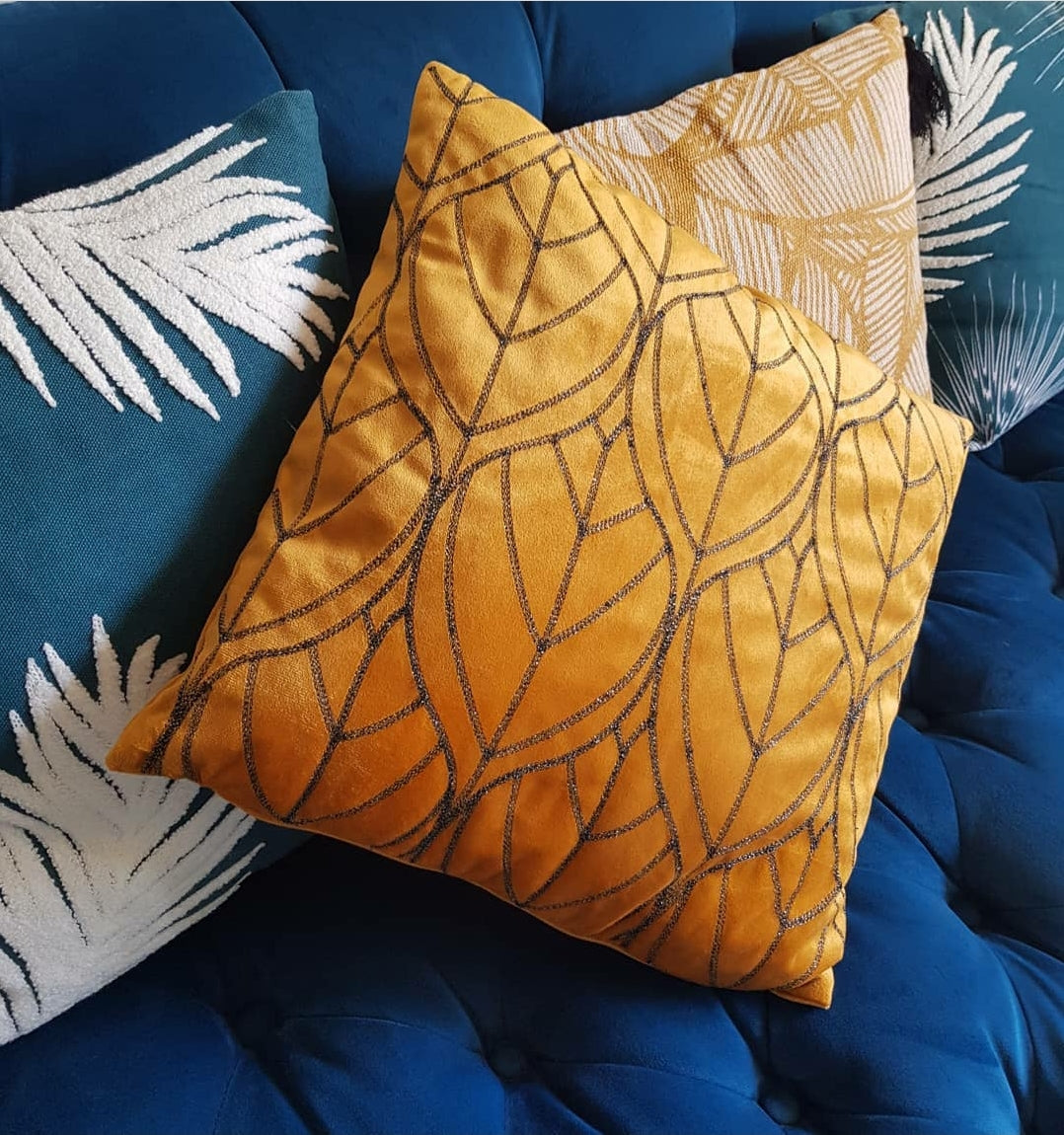 Dit stijlvolle kussen is gemaakt in een veelzijdige Oker Geel voor verschillende decors en heeft een groot en prachtig gedetailleerd geborduurd bladeren in glinsterende zilver/zwarte draad. Gevuld met dik en duurzaam polyester voor langdurige volheid, biedt dit weelderige kussen maximaal comfort terwijl u thuis ontspant.