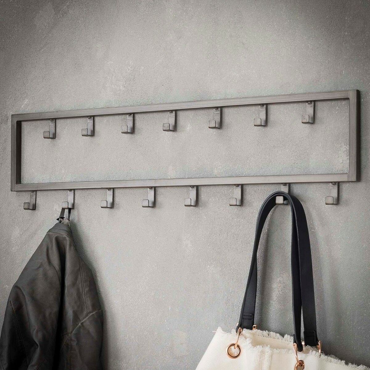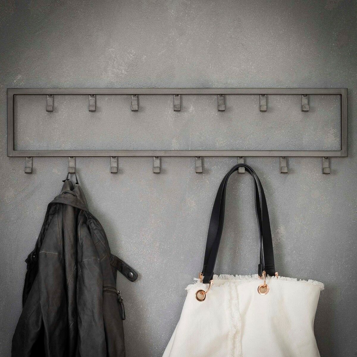 De kapstok industrieel 15 haken - 80 cm past dankzij zijn ontwerp perfect binnen een industriële, stoere of moderne inrichting. Hij is in zijn geheel gemaakt van gepoedercoat staal en heeft een zwarte afwerking gekregen. Deze variant bestaat uit 15 haakjes die verdeeld zijn over twee rijen. Hierdoor is er genoeg ruimte voor verschillende jassen, sjaals en andere accessoires. De kapstok is voorzien van twee oogjes aan de achterkant om de kapstok mee te bevestigingen. Het bevestigingsmateriaal wordt niet meegeleverd omdat verschillende wandmaterialen vragen om verschillende soorten wandbeslag. Kapstok industrieel 15 haken is licht van gewicht en daardoor gemakkelijk te bevestigen en geschikt voor diverse wandsoorten.