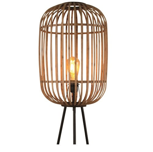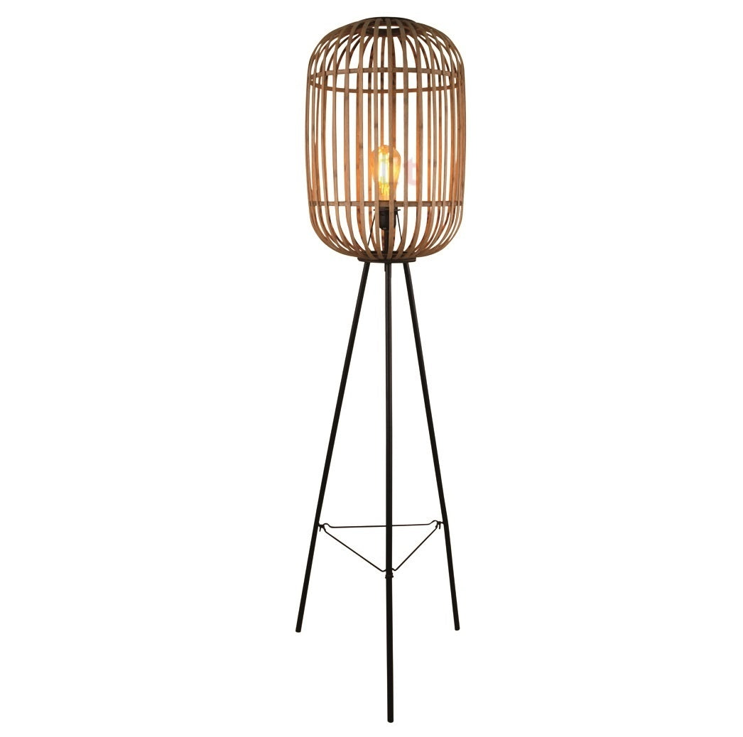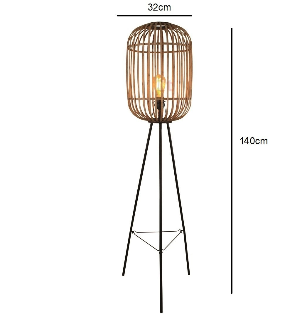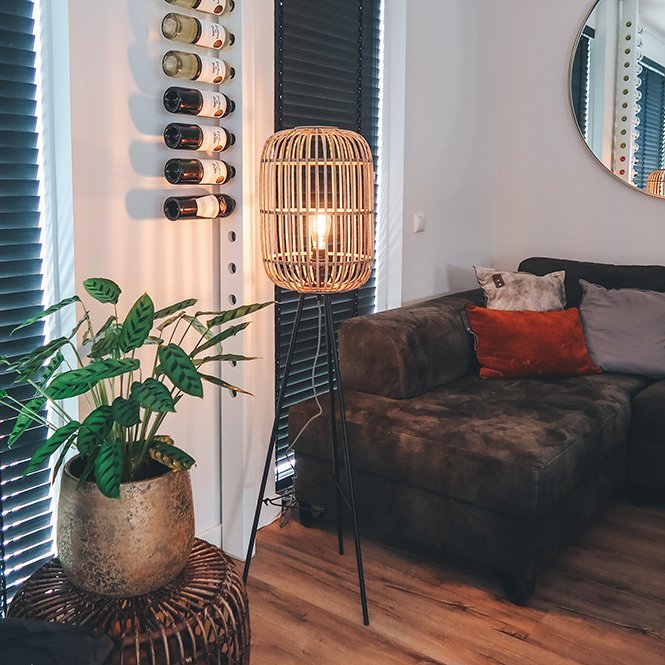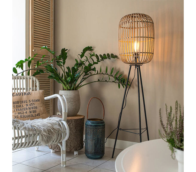 Deze trendy vloerlamp is uitgevoerd met drie mat zwarte poten en een grote kap van rotan. Deze combinatie zorgt ervoor dat deze lamp thuis hoort in onze top collectie.