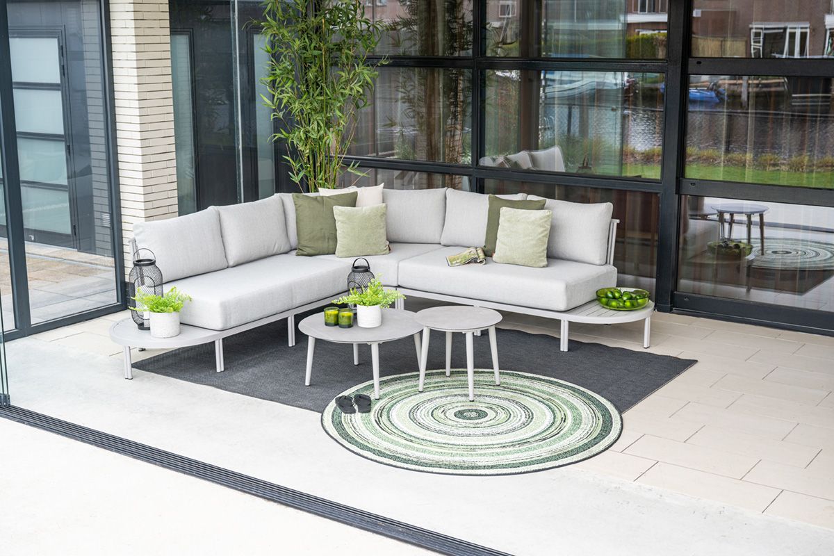 De ruime en verfrissende Frigole loungeset brengt met zijn lichte kleuren en fraaie materialen een bijzondere sfeer in jouw tuin of buitenruimte. Naast het uitstekende zitcomfort biedt de set ook veel ruimte voor jou en je gasten, evenals voor hapjes en drankjes. Dankzij de praktische plateaus aan beide zijden van de bank heb je altijd alles binnen handbereik. Deze vijfdelige set bestaat uit twee bankdelen, een hoekelement en twee bijzettafels. Het hoekelement heeft een trapeze-zit, waardoor de hoek als extra zitplaats kan worden gebruikt.