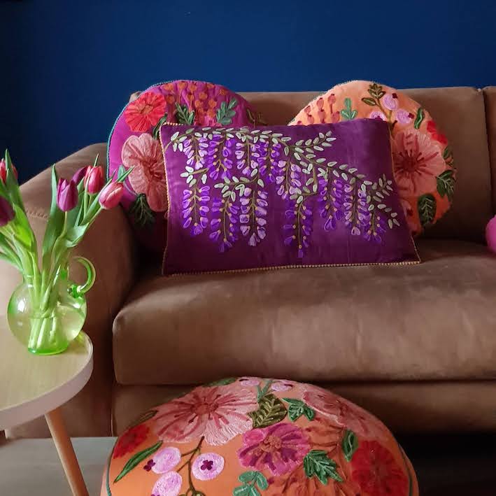 Fuchsia roze velvet kussen met handgeborduurde bloemen - rond 50cm