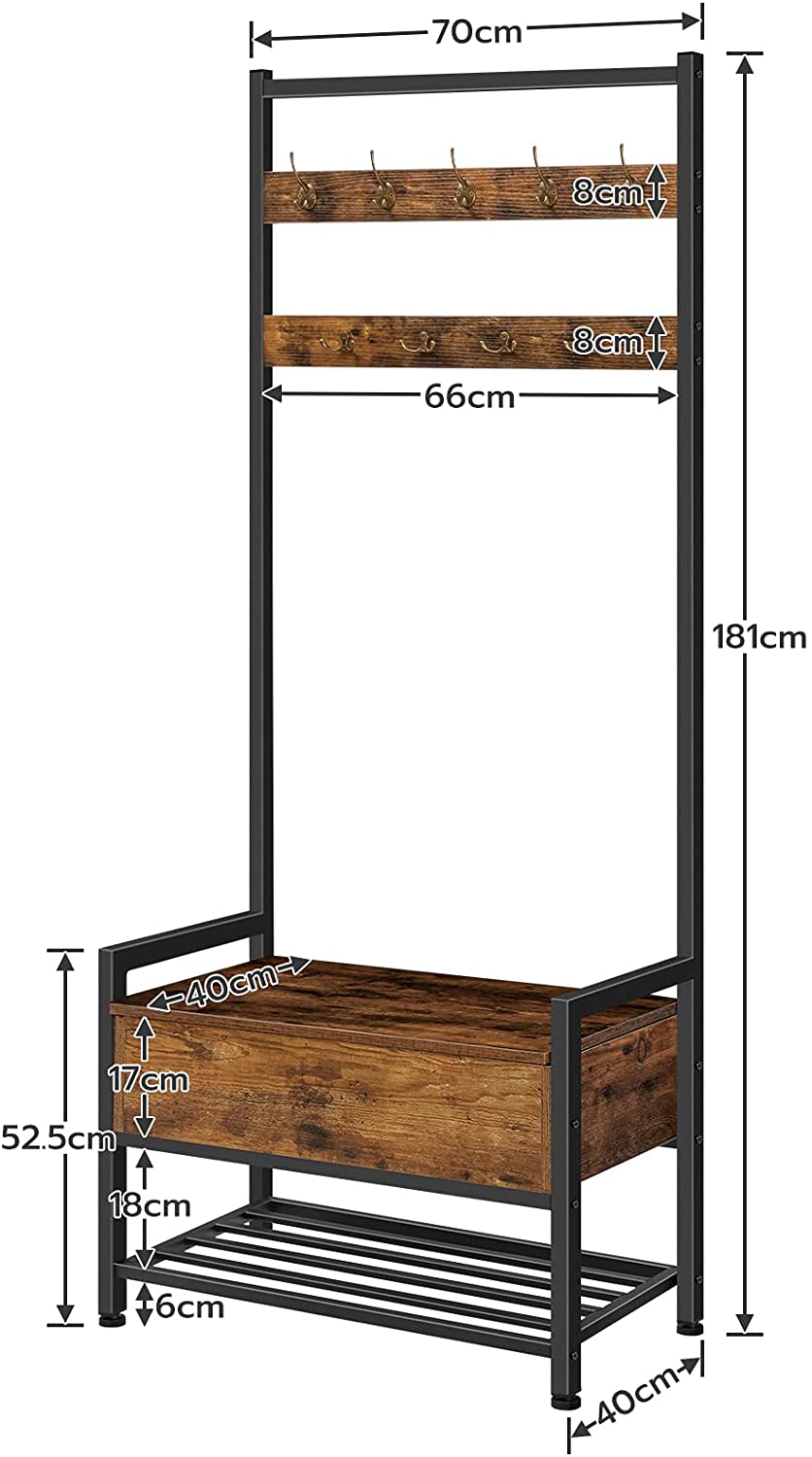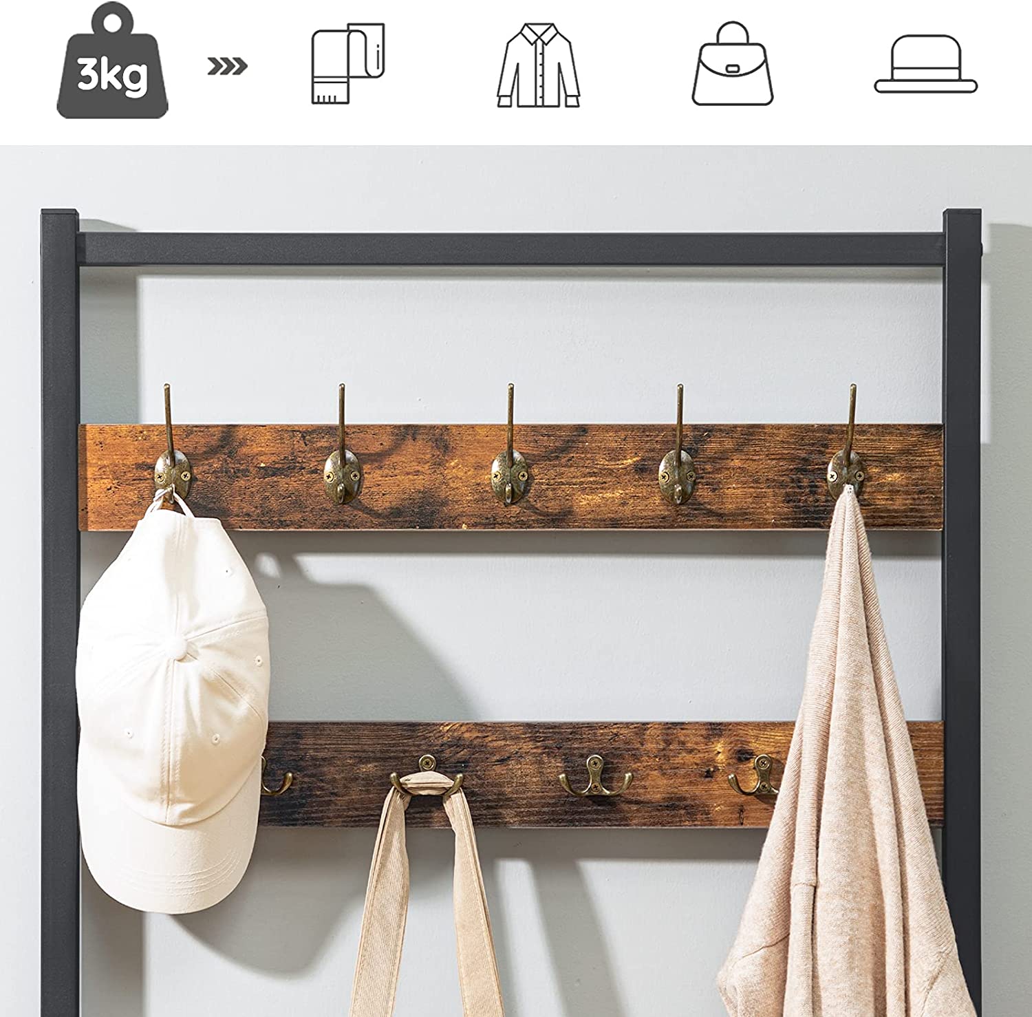 Het gangrek heeft 9 unieke haken, waarvan elk een draagvermogen van 3 kg heeft, en de onderste opbergkast heeft een draagvermogen van 80 kg. De combinatie van ijzer en hout maakt het rek zeer stabiel en elk halrek is uitgerust met anti-kantelinrichtingen, wat zijn stabiliteit verhoogt.