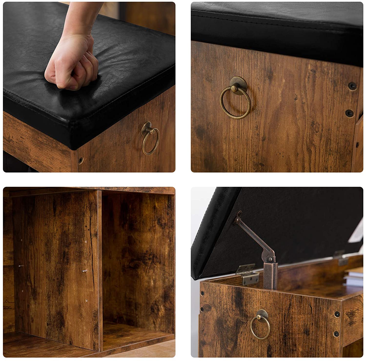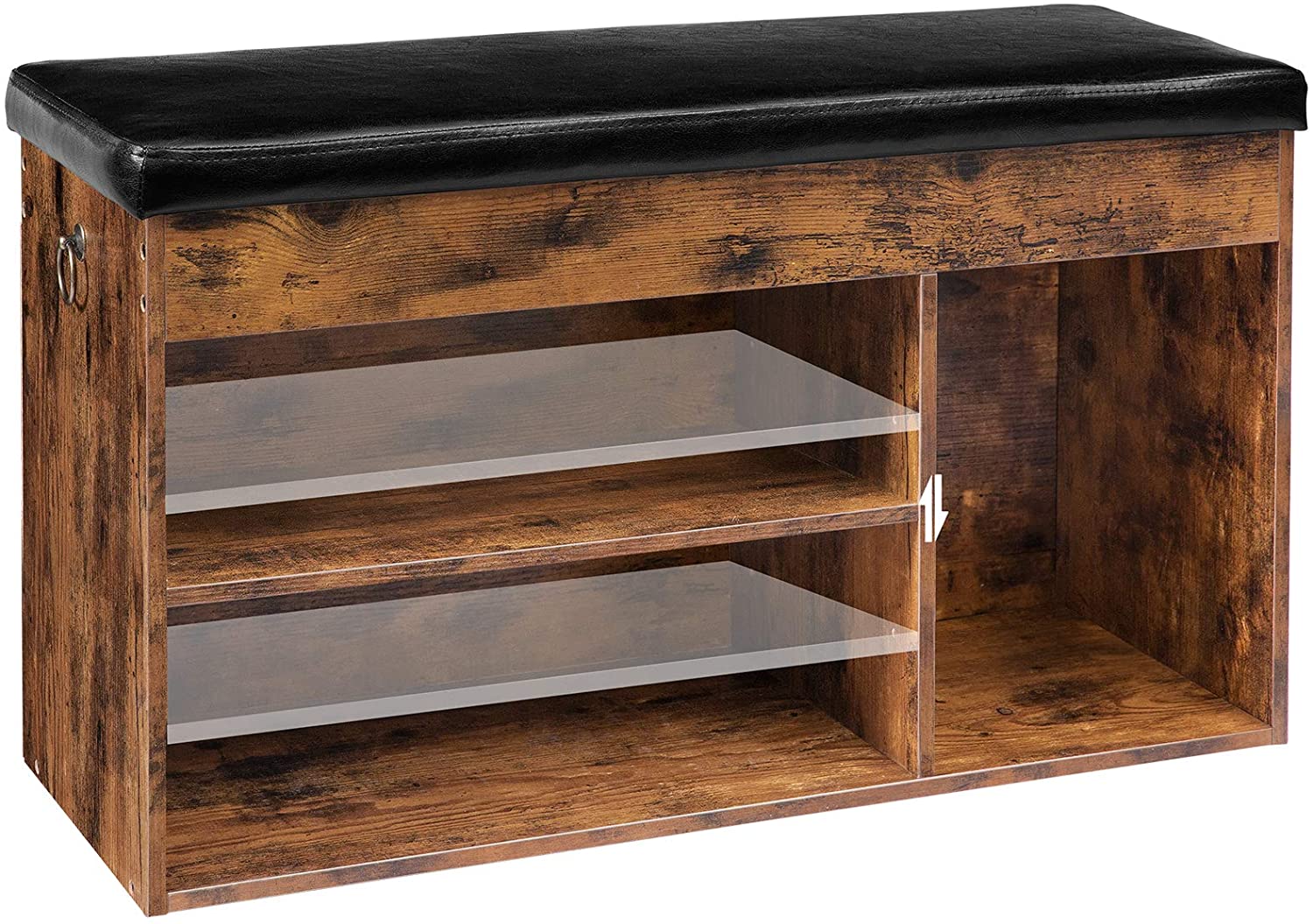 De zitting kan omhoog geklapt worden om je spullen erin op te bergen: handschoenen, mutsen, etc.. Schoenenkast met verstelbare plank, die op de gewenste hoogte kan worden ingesteld. De rechterkant kan hoge laarzen bevatten