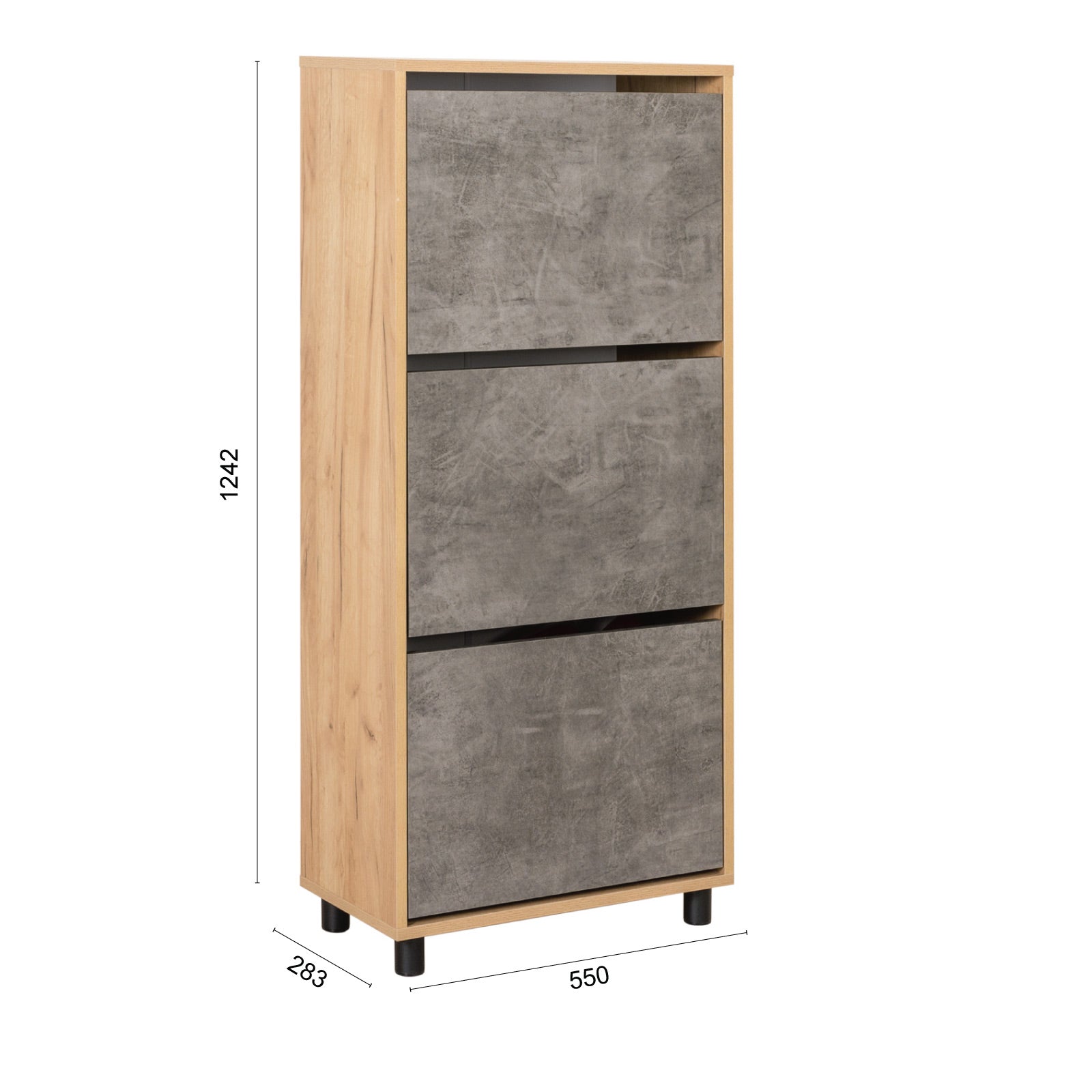 Sharons choice eiken grijs is een staand schoenenkast dat past in zowel woonkamers ,hal als slaapkamers. De Sharons choice is voorzien van 3 lades . Sharons choice heeft een MDF constructie afgewerkt in eiken met een grijze versiering in de afwerking van lades en plank De Sharons choice heeft een industriële uitstraling. schoenenkast Sharons choice heeft een breedte van 55x28x124 cm