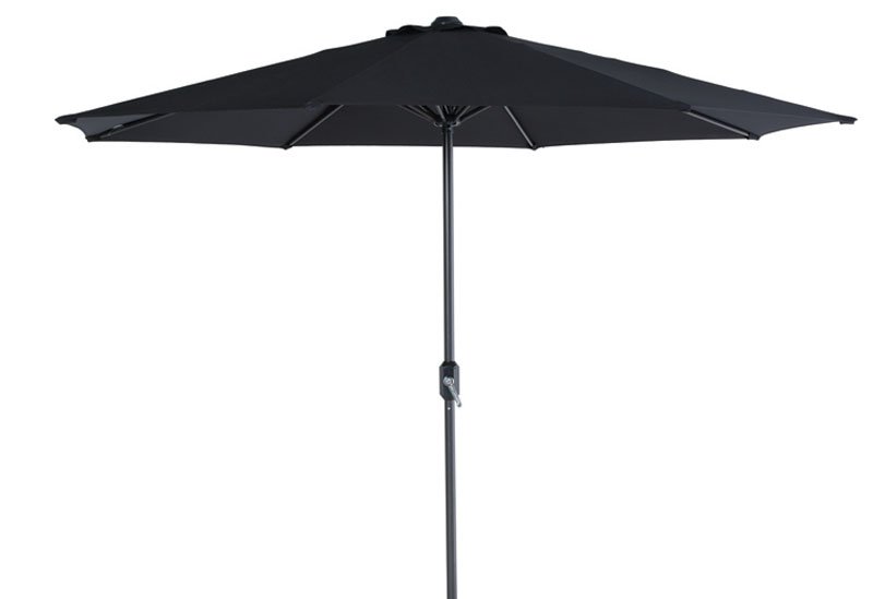 Het lichtgewicht frame van de parasol is gemaakt van een stevig aluminium, voorzien van poeder coating. Het 180 grams polyester zwart kleurig parasoldoek heeft een windvanger en is spatwaterdicht. De parasolbuis is Ø38mm en de parasol is Ø300x225cm.